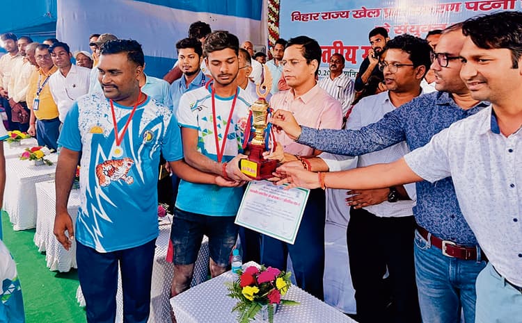 गोपालगंज. बिहार राज्य प्राधिकरण व गोपालगंज जिला प्रशासन के संयुक्त तत्वावधान में शहर के मिंज स्टेडियम में आयोजित राज्यस्तरीय अंडर-17 खो-खो प्रतियोगिता में चौथे दिन बेतिया व भागलपुर की टीमों के बीच फाइनल मुकाबला संघर्षपूर्ण व रोचक रहा. इसमें बेतिया को हरा कर भागलपुर की टीम प्रतियोगिता की विजेता ट्रॉफी हासिल कर चैंपियन बनी. टॉस जीतकर डिफेंस च्वाइस लिये चार इनिंग के खेल में भागलपुर टीम के द्वारा 22 अंक हासिल किये गये जबकि बेतिया की टीम 13 अंक ही हासिल कर सकी. इस प्रकार बेहतर प्रदर्शन कर नौ अंकों की बढ़त बनाकर विजेता ट्रॉफी पर भागलपुर की टीम ने अपना कब्जा जमा लिया. वहीं, बेतिया की टीम उपविजेता बनी. फाइनल मैच में खिलाड़ियों की तेजी, चतुराई व बेहतरीन ड्राइविंग व शारीरिक संतुलन देख दर्शकों ने खूब तालियां बजायीं. प्रदर्शन करते हुए खेला गया. उल्लेखनीय है कि 19 अक्तूबर से चल रही प्रतियोगिता में 32 जिलों के खिलाड़ियों ने अपनी खेल प्रतिभा दिखायी. खो-खो खेल को लेकर खिलाड़ियों व खेल प्रमियों का उत्साह देखते बना. खेल में निर्णायक रेफरी, अंपायर, स्कोरर के रूप में अभिषेक कुमार व यादव पवन सिंह, रोहित कुमार बेहरा, मनीष कुमार, मुन्ना कुमार, अमित कुमार, राहुल सिंह, रौशन कुमार, विनीत कुमार शर्मा ने भूमिका निभायी. जीत के बाद एक-दूसरे को दी बधाई, बांटीं खुशियां राज्यस्तरीय खो-खो खेल में भागलपुर एवं बेतिया की 28 सदस्यीय टीम ने जीत के बाद एक-दूसरे को बधाई दी और खुशियां बांटी. भागलपुर जिले की टीम में आकाश कुमार, आयुष कुमार, हिमांशु कुमार, मानव राज, दिव्यांशु कुमार, गोविंद कुमार, प्रीतम राज, नीरज कुमार, ब्रह्मा कुमार, पीयूष कुमार, विक्रम कुमार, आकाश कुमार तथा टीम मैनेजर के रूप में मोहम्मद शहजाद व दिलखुश कुमार थे. वहीं बेतिया की टीम में धीरज कुमार, रुपेश कुमार, आनंद कुमार, श्यामसुंदर कुमार, करण आलम, गोलू कुमार, अजीत कुमार, मोहित कुमार, आदित्य कुमार, आयुष कुमार मनीष कुमार, राधा कृष्णा पटेल तथा टीम मैनेजर के रूप में सुभाष पटेल व प्रमोद कुमार समेत अन्य थे. इससे पूर्व शहर के सरस्वती संगीत कला केंद्र की छात्राओं के द्वारा पुरस्कार वितरण से पूर्व सांस्कृतिक कार्यक्रम की प्रस्तुति की गयी. छात्राओं ने अपनी प्रस्तुति से सबका मन मोहा. छात्राओं ने झिझिया संगीत पर भाव नृत्य, एक राधा-एक मीरा गीत पर समूह नृत्य तथा मार्शल आर्ट की छात्राओं ने भी सुरक्षा को लेकर अपनी प्रस्तुति से वाहवाही लूटी. पुरस्कार वितरण के दौरान मिंज स्टेडियम तालियों से गूंज उठा. खेल आयोजन तथा पुरस्कार वितरण में अनुमंडल पदाधिकारी डॉ प्रदीप कुमार, डीइओ योगेश कुमार, वरीय कोषागार पदाधिकारी शशिकांत आर्या, जिला खेल पदाधिकारी अब्दुल रशीद अंसारी, ग्रामीण विकास पदा