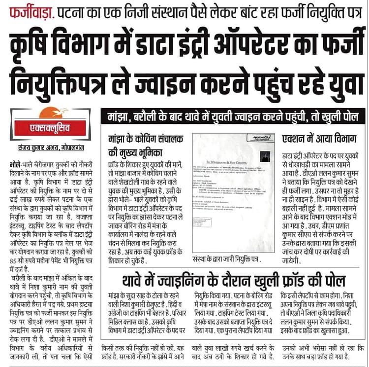 प्रभात खबर ने 10 अप्रैल के अंक में इस फर्जीवाड़े को उजागर किया. कृषि विभाग में ब्लॉकवार डाटा इंट्री ऑपरेटर की नियुक्ति के नाम पर दो से ढाई लाख रुपये लेकर पटना की एक निजी संस्था के द्वारा नियुक्ति पत्र बांटा जा रहा है. बजाप्ता इंटरव्यू, टाइपिंग टेस्ट के बाद लैपटॉप देकर कृषि विभाग के ब्लॉक में डाटा इंट्री ऑपरेटर का नियुक्ति पत्र मेल पर भेज कर योगदान कराया जा रहा है.