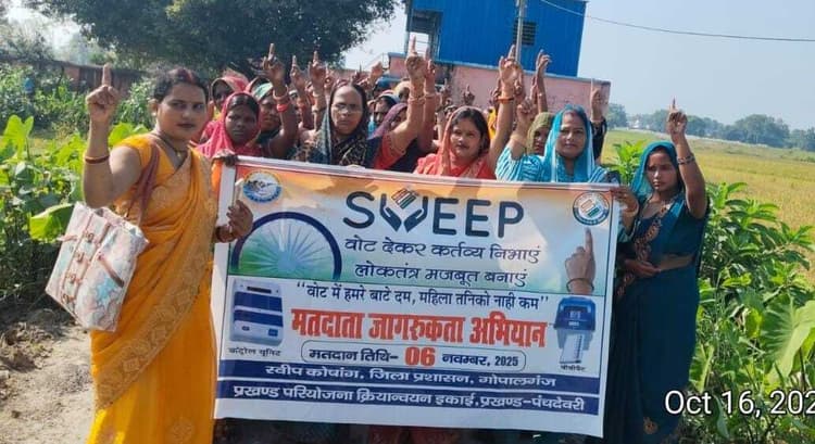 गोपालगंज. विधानसभा चुनाव में अधिक मतदान सुनिश्चित करने के लिए जीविका की ओर से मतदाता जागरूकता अभियान तेज हो गया है. रंगोली, मेहंदी, रैली और शपथ कार्यक्रमों के बाद अब जीविका दीदियां गीतों के माध्यम से लोगों को मतदान के लिए प्रेरित कर रही हैं. गुरुवार को पंचदेवरी प्रखंड के मझवलिया गांव में बंधन जीविका समूह की महिलाएं टोली बनाकर सड़कों पर उतरीं. उन्होंने जिला प्रशासन द्वारा बनाये गये मतदाता जागरूकता स्लोगनों को गीतों की लय में गाया. कनिया बहुरिया बूथ पर जायी जाके अपन वोट गिरायी ” और “गोपालगंज जगमग हो जायी, छह नवंबर के वोट गिरायी ” जैसे भोजपुरी गीतों से पूरा माहौल गूंज उठा. दीदियों के गीत सुनकर ग्रामीण भी जुटने लगे और मतदान के महत्व को समझने लगे. जीविका दीदियों ने लोगों से अपील की कि वे छह नवंबर को अपने सभी कार्य छोड़कर पहले मतदान केंद्र पहुंचें और अपने मताधिकार का उपयोग करें. कार्यक्रम में बड़ी संख्या में जीविका समूह की महिलाएं शामिल हुईं.