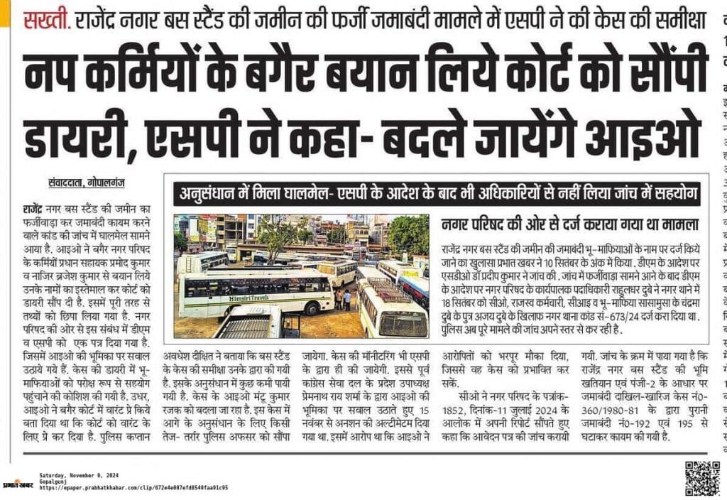 राजेंद्र नगर बस स्टैंड की जमीन की जमाबंदी भू-माफियाओं के नाम पर दर्ज किये जाने का खुलासा प्रभात खबर ने 10 सितंबर के अंक में किया. डीएम के आदेश पर एसडीओ डॉ प्रदीप कुमार ने जांच किया. जांच में फर्जीवाड़ा सामने आने के बाद डीएम के आदेश पर नगर परिषद के कार्यपालक पदाधिकारी राहुल दुबे ने नगर थाना में 18 सितंबर को सीओ, राजस्व कर्मचारी, सीआइ और अजय दुबे के खिलाफ नगर थाना कांड सं-673/24 दर्ज करा दिया था. पुलिस अब पूरे मामले की जांच अपने स्तर से कर रही है.