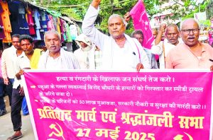 हाजीपुर. महुआ के गल्ला व्यवसायी विनोद चौधरी और गंगा ब्रिज थाना क्षेत्र के अमरजीत कुमार की हत्या के विरोध में भाकपा माले कार्यकर्ताओं ने मंगलवार को शहर में प्रतिवाद मार्च निकाला. मार्च स्थानीय अक्षयवट राय स्टेडियम से प्रारंभ होकर गांधी चौक पहुंचा, जहां सभा का आयोजन हुआ. सभा की शुरुआत मृतक विनोद चौधरी और अमरजीत कुमार को श्रद्धांजलि देते हुए एक मिनट के मौन से की गयी. प्रतिवाद मार्च का नेतृत्व माले के जिला सचिव विशेश्वर प्रसाद यादव ने किया. उन्होंने मांग की कि विनोद चौधरी के हत्यारों की अविलंब गिरफ्तारी हो, मृतक के परिजनों को 50 लाख रुपये मुआवजा और एक सदस्य को सरकारी नौकरी मिले. साथ ही सभी व्यापारियों की सुरक्षा सुनिश्चित की जाये. उन्होंने सहदुल्लाहपुर सातन पंचायत निवासी अमरजीत कुमार की हत्या की उच्च स्तरीय जांच और प्राथमिकी दर्ज करने की भी मांग की. सभा को मजिंदर साह, ज्वाला कुमार, रामबाबू भगत, गोपाल पासवान, कुमारी गिरिजा पासवान, कविता देवी, पवन कुमार राय सहित अन्य नेताओं ने संबोधित किया.हत्या से आक्रोशित लोगों ने फूंका सीएम का पुतला
