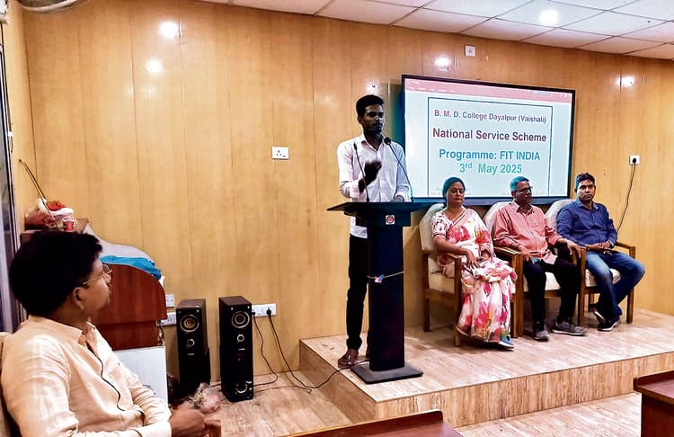 राजापाकर. राष्ट्रीय सेवा योजना की ओर से बीएमडी महाविद्यालय दयालपुर के स्मार्ट कक्ष परिसर में फिट इंडिया कार्यक्रम का आयोजन किया गया. कार्यक्रम में छात्रों को संबोधित करते हुए प्राचार्य डॉक्टर श्याम रंजन प्रसाद सिंह ने कहा कि फिट इंडिया कार्यक्रम भारत के तत्कालीन प्रधानमंत्री नरेंद्र मोदी के द्वारा शुरू किया गया है. इसका उद्देश्य देश का प्रत्येक व्यक्ति स्वस्थ रहे. हमें स्वस्थ रहने के लिए योग, व्यायाम, साइकिलिंग, पैदल चलना जैसे विद्या अपनाना चाहिए .हमें अपने खान-पान को सही कर बीमारी से दूर रह सकते हैं. जब शारीरिक कार्य करना बंद कर देते हैं तो बीमारी हमें जल्दी पकड़ लेती है. इसलिए हम सबको यह शपथ लेना है कि शरीर को स्वस्थ रखने के लिए प्रत्येक दिन आधा घंटा हमें योग, व्यायाम या पैदल चलना अपने जीवन में शामिल करना चाहिए. प्रोफेसर जया चौधरी ने कहा कि हमें अपने खान-पान में उचित एवं संतुलन आहार से स्वस्थ रह सकते हैं. शरीर को फिट रखने के लिए प्रोटीन, कार्बोहाइड्रेट ,वसा जैसी चीज आसानी से फल, साग एवं दाल से प्राप्त कर सकते हैं. कार्यक्रम का धन्यवाद ज्ञापन प्रोफेसर रवि रंजन कुमार ने किया. छात्र शिवम कुमार, उज्जवल कुमार सिंह, छात्रा अनामिका कुमारी, नंदनी कुमार सहित अन्य छात्र छात्राओं ने भी अपने-अपने विचार व्यक्त किया.