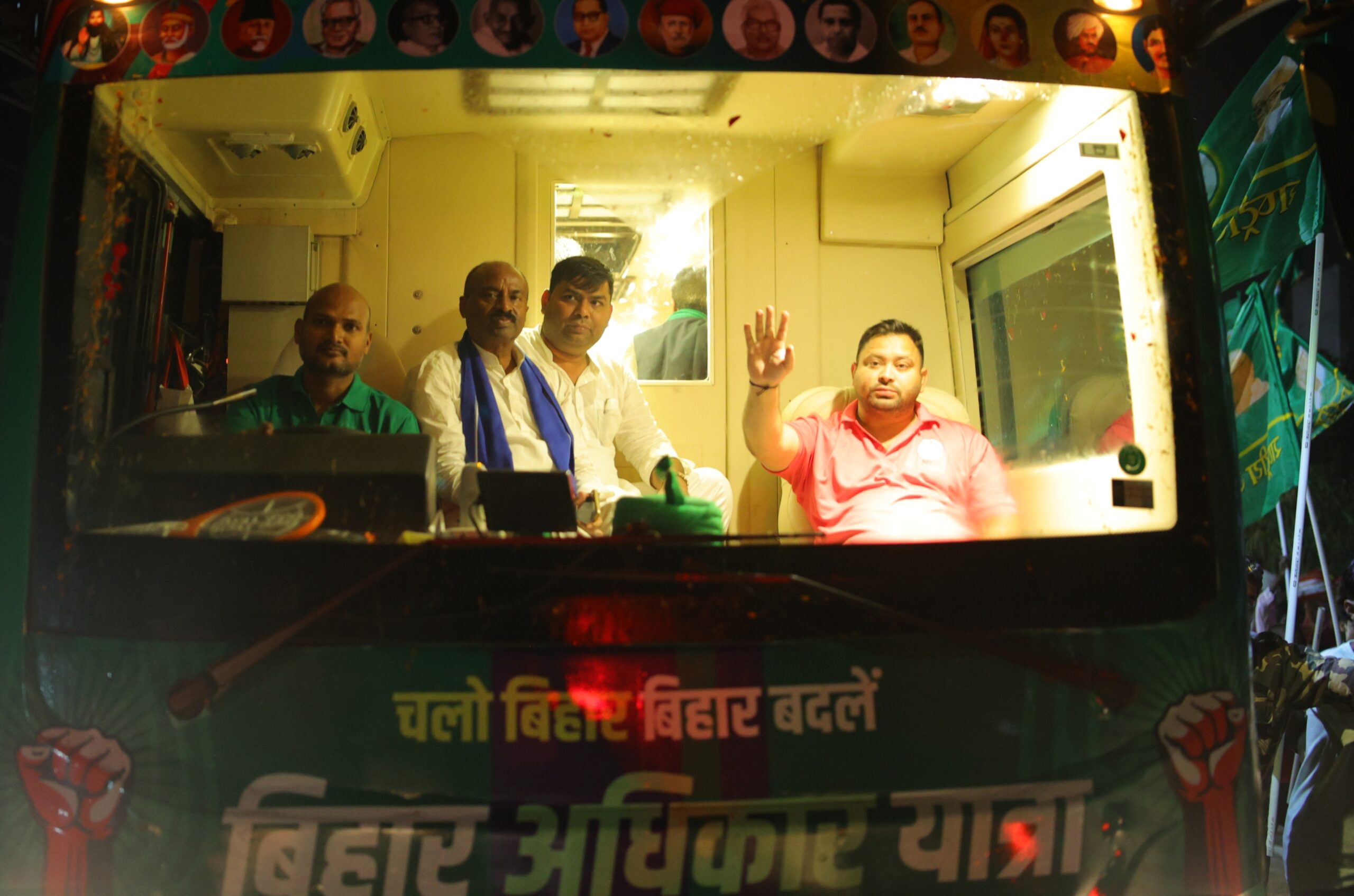 पूर्व में दिए गए सूचना से करीब 6 घंटे बाद गांधी मैदान पहुंचे प्रतिपक्ष तेजस्वी यादव के जन अधिकार यात्रा में देर शाम में समर्थकों की भीड़ उमड़ पड़ी. तेजस्वी के सभा के दौरान काफी संख्या में समर्थकों को मंच पर चढ़ जाने के कारण मंच का दाहिने हिस्सा टूट गया. जिसे देखते ही सुरक्षाबलों ने बिना विलंब किए समर्थकों को मंच से उतारकर तेजस्वी यादव की ओर घेराबंदी कर लोगो को आने से रोक दिया. इस दौरान राजद के वरिष्ठ नेता सुनील सिंह, अन्नू शुक्ला, पैक्स अध्यक्ष शशि कुमार, बैद्यनाथ राय, श्रीकांत यादव, रामाशंकर यादव, मो सरफराज सहित कई लोग उपस्थित थे. के साथ अन्य लोगों ने श्री यादव को अंगवस्त्र,मोमेंटो तथा चांदी का मुकुट पहनाकर भव्य स्वागत किया.एक बिहारी सौ पर भारी के नारे पर उत्साहित हुए राजद कार्यकर्ता