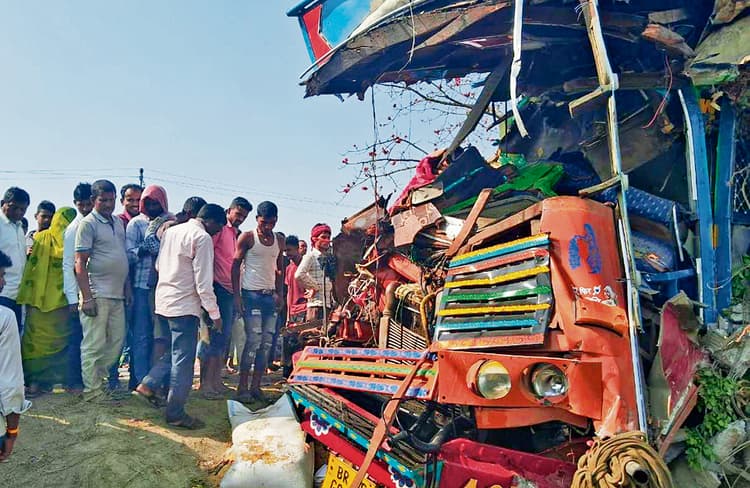 लालगंज. लालगंज-फकुली मुख्य मार्ग पर मलंग चौक से 200 मीटर उत्तर कांटी मोड़ के पास बुधवार दोपहर दो ट्रकों की आमने-सामने की टक्कर में एक ट्रक का चालक गंभीर रूप से घायल हो गया. वहीं, दूसरा चालक भाग निकला. बताया जाता है कि फकुली की ओर से आ रहे मुर्गी दाना लदे ट्रक को लालगंज की ओर से तेज रफ्तार में आ रहे एक खाली ट्रक ने जोरदार टक्कर मार दी. टक्कर इतनी भीषण थी कि भारी आवाज के साथ ट्रक सड़क किनारे नाले की ओर फिसल गया और सेमल के पेड़ से टकराकर रुक गया. घटना के बाद मौके पर जुटे स्थानीय लोगों ने डायल-112 पर सूचना दी. पुलिस मौके पर पहुंचकर घायल चालक को इलाज के लिए हाजीपुर सदर अस्पताल भेज दिया. घायल चालक की पहचान भगवानपुर थाना क्षेत्र के खुर्द बखरा गांव निवासी बुटन पासवान के पुत्र रंजन कुमार (35) के रूप में हुई है. उसकी स्थिति नाजुक बतायी जा रही है. हादसे के बाद दूसरे ट्रक का चालक मौके का फायदा उठाकर फरार हो गया. सूचना पर पहुंची लालगंज थाना की पुलिस ने दोनों ट्रकों को जब्त कर लिया. इस संबंध में लालगंज थानाध्यक्ष सह प्रशिक्षु आईपीएस शैलजा ने बताया कि अभी तक किसी ने थाना में आवेदन नहीं दिया है, जिससे मामला दर्ज किया जा सके. हालांकि, पुलिस मामले की जांच कर रही है.