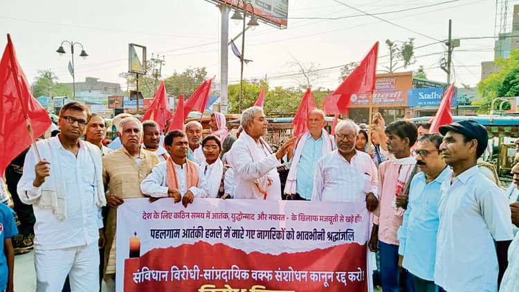 भाकपा माले और इंसाफ मंच के बैनर तले सैकड़ों लोगों ने शहर के अनवरपुर चौक स्थित आंबेडकर स्मारक से वक्फ संशोधन विधेयक वापस लेने का नारा लगाते हुए मार्च किया