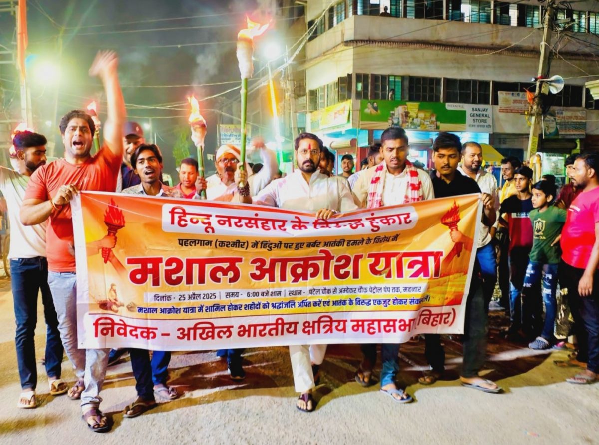 महनार. जम्मू-कश्मीर के पहलगाम में हुए आतंकी हमले के विरोध में अखिल भारतीय क्षत्रिय महासभा ने महनार में मशाल आक्रोश यात्रा निकालकर अपना रोष प्रकट किया. महासभा के प्रदेश अध्यक्ष जय सिंह राठौड़ राय के नेतृत्व में यह यात्रा पटेल चौक से आंबेडकर चौक तक निकाली गयी. यात्रा में शामिल लोगों ने पाकिस्तान के खिलाफ जमकर नारेबाजी की. प्रदर्शनकारियों ने पाकिस्तान के प्रधानमंत्री शाहबाज शरीफ और सेना प्रमुख जनरल मुनीर के विरुद्ध भी नारेबाजी की. महासभा के प्रदेश अध्यक्ष जय सिंह राठौड़ ने कहा कि पाकिस्तान भारत के धैर्य की परीक्षा न लें. उन्होंने कहा कि पाकिस्तान के समर्थन से आतंकियों ने जिस प्रकार पर्यटकों की हत्या की है, उसका परिणाम उसे भुगतना होगा. सभा के समापन पर पहलगाम हमले में मारे गए लोगों की आत्मा की शांति के लिए प्रार्थना की गयी. इस अवसर पर विवेक कुमार सिंह, नीरज कुमार सिंह, किशन शर्मा, अविनाश कुमार, भूषण कुमार सिंह, धीरज कुमार सिंह, हर्ष राज, सचिन कुमार, आनंद कुमार, रौशन कुमार, अंकित कुमार, आकाश कुमार, कुंदन कुमार आदि उपस्थित थे.