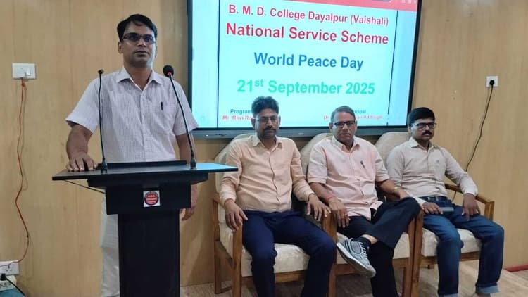 राजापाकर. राष्ट्रीय सेवा योजना ने बीएमडी महाविद्यालय दयालपुर के स्मार्ट कक्षा परिसर में विश्व शांति दिवस मनाया. कार्यक्रम का मंच संचालन कार्यक्रम पदाधिकारी प्रो रविरंजन कुमार ने किया. कार्यक्रम की अध्यक्षता करते हुए प्राचार्य श्याम रंजन प्रसाद सिंह ने कहा कि मानव के अस्तित्व के लिए शांति आवश्यक है. विगत कई वर्षों से कई देश युद्ध में शामिल रहे हैं. यह विश्व शांति के लिए चिंता का विषय है. हम मानव जाति के समृद्धि एवं विकास के लिए युद्ध को त्याग कर शांति के मार्ग पर चलना होगा. भारत के राष्ट्रपिता महात्मा गांधी एवं गौतम बुद्ध ने शांति का उपदेश दिया. भारत ही वह देश है, जहां सभी धर्म, सभी संप्रदाय के लोगों में शांति के साथ रहते हैं. डाॅ अभिरंजन कुमार ने कहा कि शांति एवं अहिंसा वह शास्त्र है, जिसे मानव बिना लड़े दूसरों को जीत सकता है. युद्ध से विनाश हो होता है, परंतु शांति से संपूर्ण जाति का कल्याण होता है. अंत में मानव के पास शांति के मार्ग के अलावा अन्य कोई विकल्प नहीं होता है. कार्यक्रम का धन्यवाद ज्ञापन डाॅ श्वेता कुमारी ने दिया एवं कार्यक्रम में अन्य शिक्षक प्रो सुनील कुमार, कुमार संजीव रंजन सहित दर्जनों छात्र-छात्राएं उपस्थित रहे.