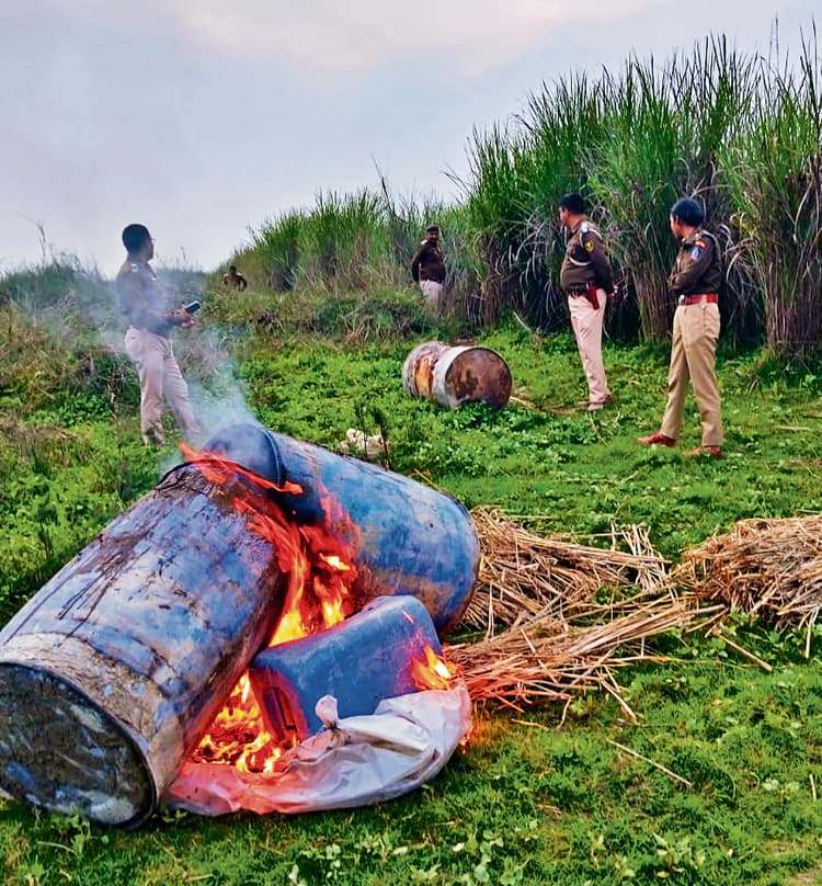 हाजीपुर. होली के मौके पर देसी और विदेशी शराब की सप्लाइ पर रोक लगाने के लिए जिले की पुलिस अलर्ट मोड में काम कर रही है. जिले के विभिन्न थानों की पुलिस शराब की खरीद-बिक्री, परिवहन, सेवन और भंडारण के खिलाफ लगातार अभियान चला रही है. इसी क्रम में लालगंज थाना की पुलिस ने थाना क्षेत्र के गंडक नदी किनारे सलेमपुर दियारा क्षेत्र में छापेमारी कर देसी शराब बनाने वाली छह भट्ठियों को ध्वस्त कर दिया. इस दौरान पुलिस ने करीब छह हजार लीटर से अधिक अर्धनिर्मित कच्चा जावा भी मौके पर ही नष्ट कर दिया. वहीं, शराब बनाने वाली सामग्री, ड्रम आदि को आग के हवाले कर दिया. हालांकि, छापेमारी के दौरान सभी धंधेबाज मौके से भागने में सफल रहे. यह जानकारी एसपी ने मीडिया को दी. बताया गया कि लालगंज थाना की पुलिस को रविवार की सुबह गुप्त सूचना मिली थी कि गंडक नदी किनारे सलेमपुर दियारा क्षेत्र में बड़े पैमाने पर देसी शराब बनायी और सप्लाई की जा रही है. सूचना मिलते ही लालगंज थानाध्यक्ष के नेतृत्व में पुलिस टीम मौके पर पहुंची और छापेमारी शुरू की. पुलिस के आने की भनक लगते ही सभी धंधेबाज इधर-उधर भाग निकले. पुलिस ने नदी किनारे झाड़ियों की ओट में चल रही शराब भट्ठियों को ढूंढ कर ध्वस्त कर दिया. इस दौरान पुलिस ने देसी शराब की छह भट्ठियों को ध्वस्त कर दिया. इस दौरान पुलिस ने प्लास्टिक के बड़े-बड़े ड्रम में रखे छह हजार लीटर से अधिक कच्चा जावा को नष्ट कर दिया और ड्रम में आग लगा दी. बताया गया कि होली के मौके पर शराब की बिक्री करने वाले धंधेबाजों पर पुलिस पैनी नजर रख रही है। विभिन्न थाना क्षेत्रों में यह अभियान लगातार जारी रहेगा.