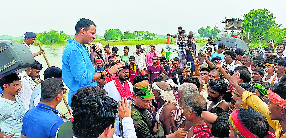 बिदुपुर. राघोपुर के दियारा क्षेत्र अंतर्गत विशनपुर सैदअली गांव में पूर्व स्वास्थ्य मंत्री तेजप्रताप यादव बाढ़पीड़ितों की मदद को पहुंचे. उन्होंने सूखा राशन का वितरण किया. इस दौरान उन्होंने मोटरसाइकिल और नाव से गांव के गली-मुहल्लों का भ्रमण कर पीड़ितों की समस्याएं सुनीं. पूर्व मुख्यमंत्री लालू प्रसाद के बड़े बेटे तेजप्रताप अपने छोटे भाई और नेता प्रतिपक्ष तेजस्वी यादव के विधानसभा क्षेत्र में चार घंटे तक बाढ़पीड़ितों के बीच रहे. उन्होंने इस दौरान स्थानीय विधायक और सरकार पर जमकर निशाना साधा. तेजप्रताप ने कहा कि आपदा की इस घड़ी में विभाग पूरी तरह फेल है और पीड़ितों को सरकार से कोई मदद नहीं मिल रही है. वापसी के क्रम में उन्होंने चेचर घाट स्थित महादेव मंदिर में पूजा-अर्चना की और शिवलिंग के चारों ओर चांदी की प्लेट लगवाने का वादा किया. मौके पर बीडीओ कुमार मनीष भारद्वाज, सीओ करिश्मा कुमारी, थानाध्यक्ष रवि प्रकाश सहित बड़ी संख्या में कार्यकर्ता और ग्रामीण मौजूद थे.