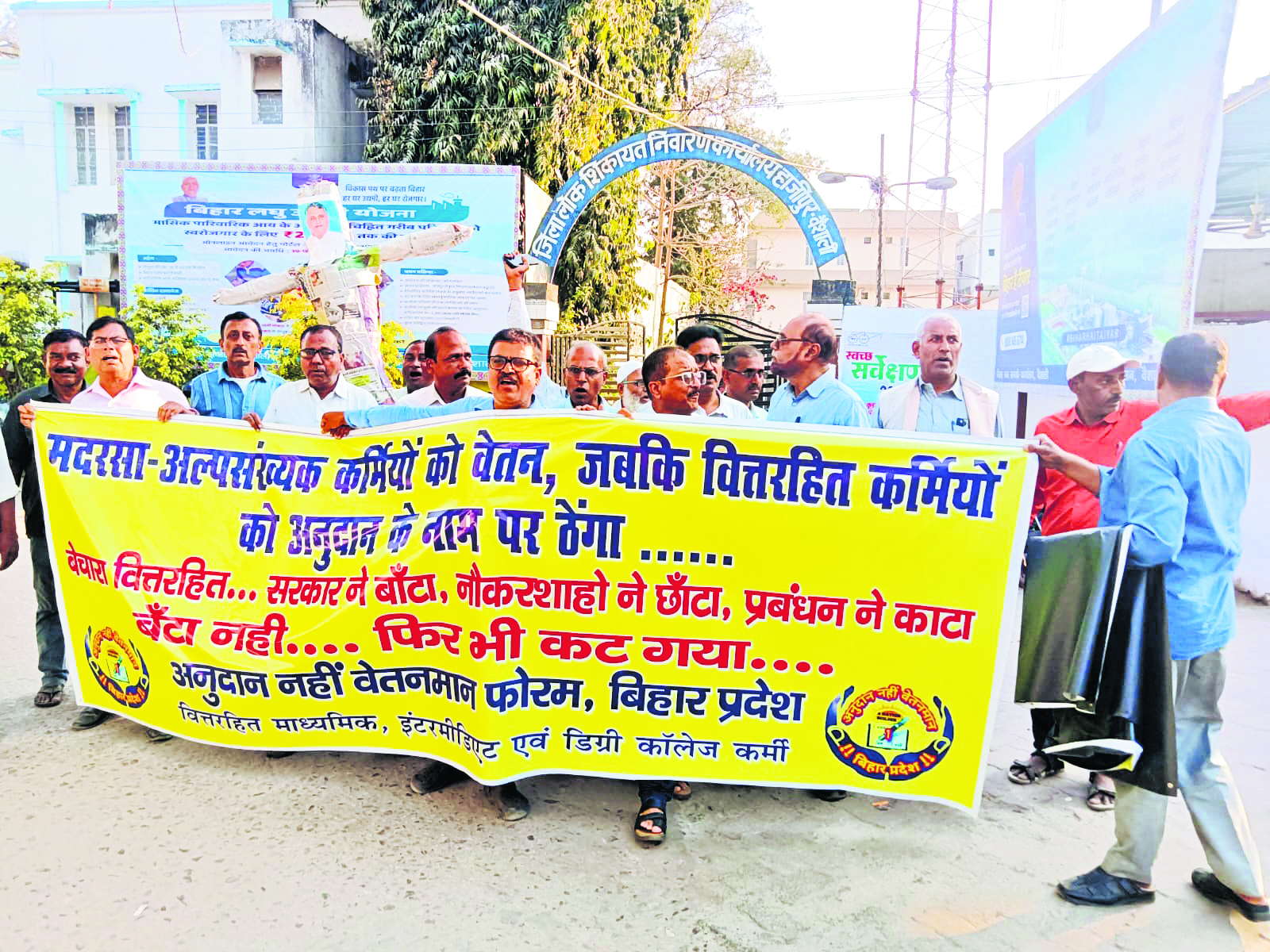 हाजीपुर. अनुदान नहीं वेतनमान फोरम के बैनरतले गुरुवार को जिले के वित्तरहित कर्मियों ने विरोध मार्च निकाला और राज्य सरकार के विरुद्ध जमकर नारेबाजी की. वित्तरहित कर्मी विधान परिषद में मंत्री विजय कुमार चौधरी द्वारा वित्तानुदानित संस्थानों और उसके कर्मियों के प्रति नकारात्मक बयान का विरोध कर रहे थे. वित्तरहित कर्मियों ने शहर के अक्षयवट राय स्टेडियम से गांधी चौक तक विरोध मार्च निकाला और राज्य सरकार के विरोध में प्रदर्शन करते हुए पुतला फूंका. कार्यक्रम का नेतृत्व एएनवी फोरम के जिला संयोजक प्रो रमेश कुमार कर रहे थे. इस दौरान वक्ताओं ने राज्य सरकार से नियमित मासिक वेतनमान की मांग करते हुए कहा कि राज्य सरकार की उदासीनता एवं उपेक्षापूर्ण सौतेला व्यवहार से तंग आकर वित्तरहित कर्मियों को सरकार के खिलाफ हल्ला बोल का आगाज करना पड़ा है. इस दौरान वित्तानुदानित कर्मियों को समकक्ष राज्यकर्मियों की भांति नियमित मासिक वेतन सहित सभी सरकारी सुविधाएं प्रदान करने तथा बकाये अनुदान का एकमुश्त भुगतान सीधे कर्मियों के खाते करने की मांग की गयी.