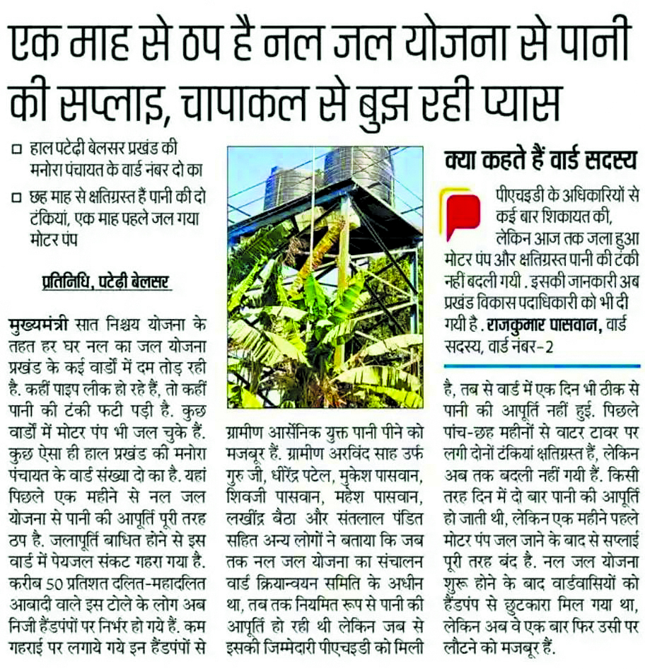 पटेढी बेलसर. पटेढ़ी बेलसर प्रखंड की मनोरा पंचायत के वार्ड संख्या दो में पिछले एक माह से नल जल योजना से पानी की सप्लाई ठप रहने से संबंधित खबर प्रभात खबर में प्रकाशित होने के बाद विभाग ने आनन-फानन में वार्ड में पानी की सप्लाई शुरू करा दी है. इस वार्ड में करीब एक माह से मुख्यमंत्री सात निश्चय योजना के तहत हर घर नल योजना से पानी की सप्लाई ठप थी. इस वार्ड में वाटर टावर पर लगी पानी की दोनों टंकी करीब पांच-छह महीनों से क्षतिग्रस्त थी. वहीं करीब एक महीने पहले मोटर पंप जल जाने के बाद से सप्लाई पूरी तरह बंद हो गया था. इसकी वजह से इस वार्ड के लोगों पेयजल की संकट का सामना करना पड़ा था. इस वार्ड के लोग चापाकल की मदद से किसी तरह अपनी प्यास बुझा रहे थे. इस समस्या से संबंधित खबर को प्रभात खबर ने 19 मार्च के अंक में एक माह से ठप है नल-जल योजना से पानी की सप्लाई, चापाकल से बुझ रही लोगों की प्यास, शीर्षक खबर से प्रमुखता से प्रकाशित किया था. प्रभात खबर में इस खबर के प्रमुखता से प्रकाशित होने के बाद प्रशासन हरकत में आ गया और आनन-फानन में इस वार्ड में नल-जल योजना से पानी की सप्लाई दुबारा शुरू कराने की कवायद शुरू की गयी. पीएचइडी के अधिकारियों ने वार्ड में लगे वाटर टावर पर क्षतिग्रस्त पानी टंकी को बदलने के बाद जले हुए मोटर पंप की जगह नया मोटर पंप लगाकर वार्ड में पानी की सप्लाइ दुबारा शुरू करायी. नल-जल योजना से से पानी सप्लाइ शुरू होने पर स्थानीय वार्ड के लोगों ने प्रभात खबर के प्रति आभार आभार व्यक्त करते हुए हर्ष व्यक्त किया है. वार्ड सदस्य राजकुमार पासवान, अरविंद गुप्ता, धीरेंद्र पटेल, मुकेश पासवान, शिवजी पासवान आदि ने कहा कि नल-जल योजना से पानी की सप्लाइ शुरू होने से लोगों को पेयजल संकट की समस्या से निजात मिल गयी है.