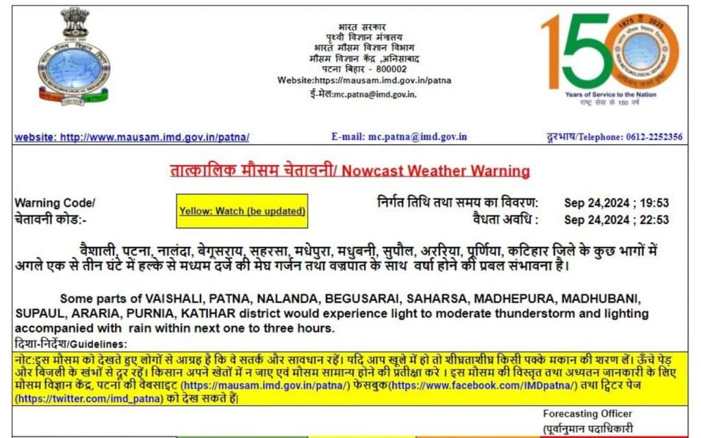 वहीं, मौसम विज्ञान केंद्र पटना की तरफ से दी गई लेटेस्ट जानकारी के मुताबिक, वैशाली, पटना, नालंदा, बेगूसराय, सहरसा, मधेपुरा, मधुबनी, सुपौल, अररिया, पूर्णिया, कटिहार जिले के कुछ भागों में अगले एक से तीन घंटे में हल्के से मध्यम दर्जे की मेघ गर्जन तथा वज्रपात के साथ वर्षा होने की प्रबल संभावना है.