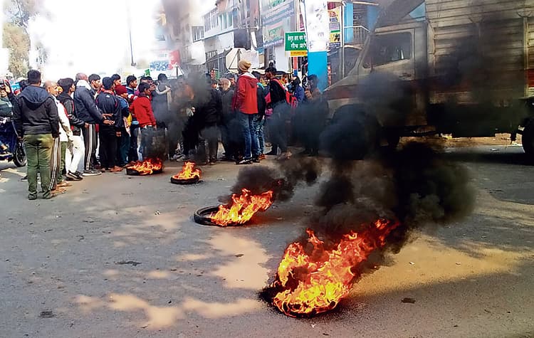 सड़क पर टायर जलाकर विरोध प्रदर्शन