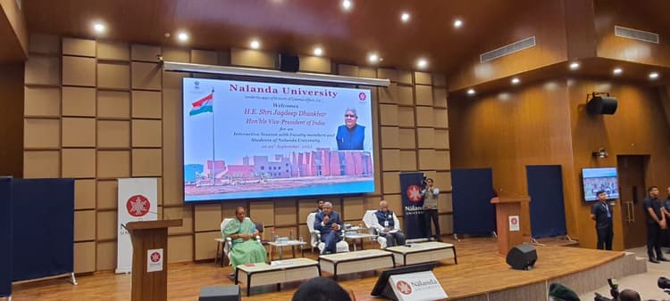 ज्ञान-अर्जन और शिक्षा के क्षेत्र में नालंदा की ज्ञान परंपरा अतुलनीय है. नालंदा विश्वविद्यालय अपने इतिहास और विरासत के कारण दुनिया में अलग पहचान रखता है. देश के उपराष्ट्रपति जगदीप धनखड़ ने नालंदा विश्वविद्यालय के सुषमा स्वराज सभागार में शुक्रवार को आयोजित कार्यक्रम में यह बातें कहीं. उपराष्ट्रपति नालंदा विश्वविद्यालय के आचार्यों और देशी विदेशी छात्रों से संवाद के दौरान कहा कि वसुधैव कुटुंबकम, एक पृथ्वी, एक परिवार, एक भविष्य का विचार यहां जमीनी हकीकत है. अपनी अंतर्दृष्टि साझा करते हुए उपराष्ट्रपति ने प्राचीन नालंदा के अंतरराष्ट्रीय संबंधों और सदियों पुराने सभ्यतागत मूल्यों पर अपने विचार व्यक्त किये.