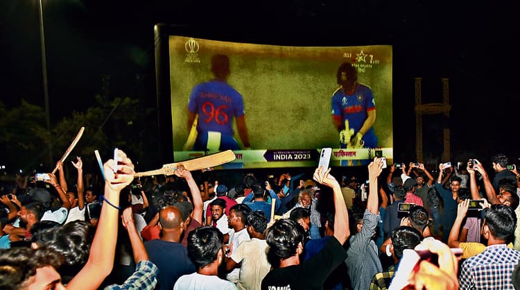 India-Pakistan Match Photos:वर्ल्ड कप के प्रसारण को लेकर आमजन बहुत उत्साहित भी दिखे. बता दें कि इस मेगा स्क्रीन के साथ शहर में लगे वीएमडी पर हर वर्ल्ड कप मैच का लाइव प्रसारण किया जाता है.