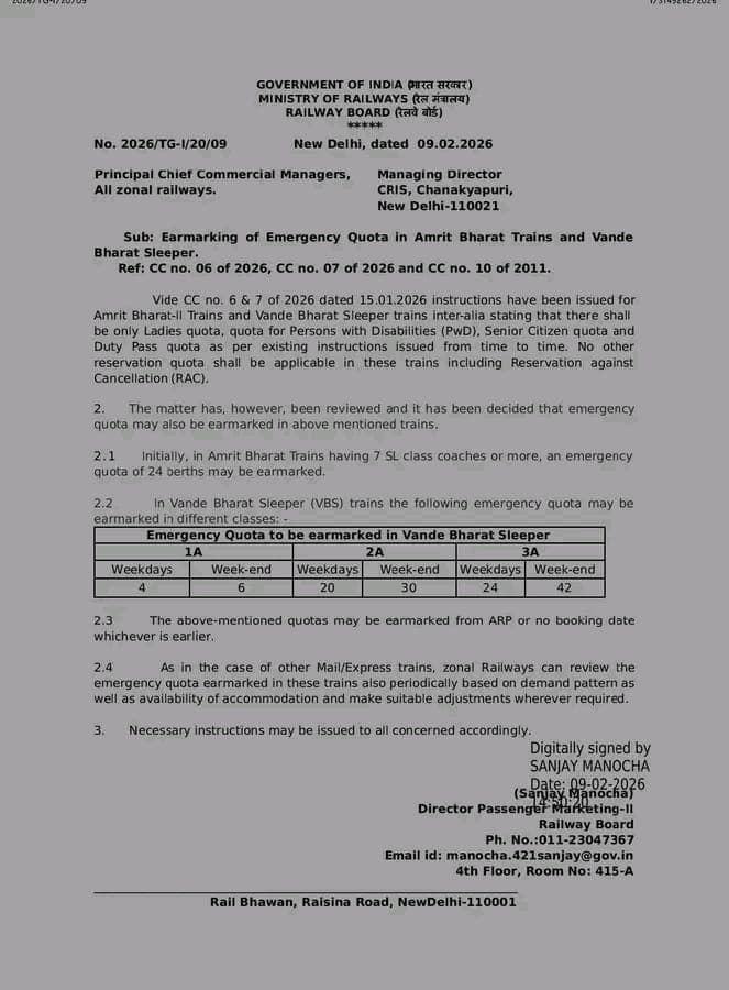अब तक अमृत भारत और वंदे भारत स्लीपर ट्रेनों में इमरजेंसी कोटा का प्रावधान नहीं था. ऐसे में अचानक यात्रा की स्थिति में यात्रियों को कठिनाई का सामना करना पड़ता था. नए फैसले से विशेष परिस्थितियों जैसे चिकित्सकीय आपातकाल, पारिवारिक कारण या सरकारी आवश्यकता में राहत मिल सकेगी.