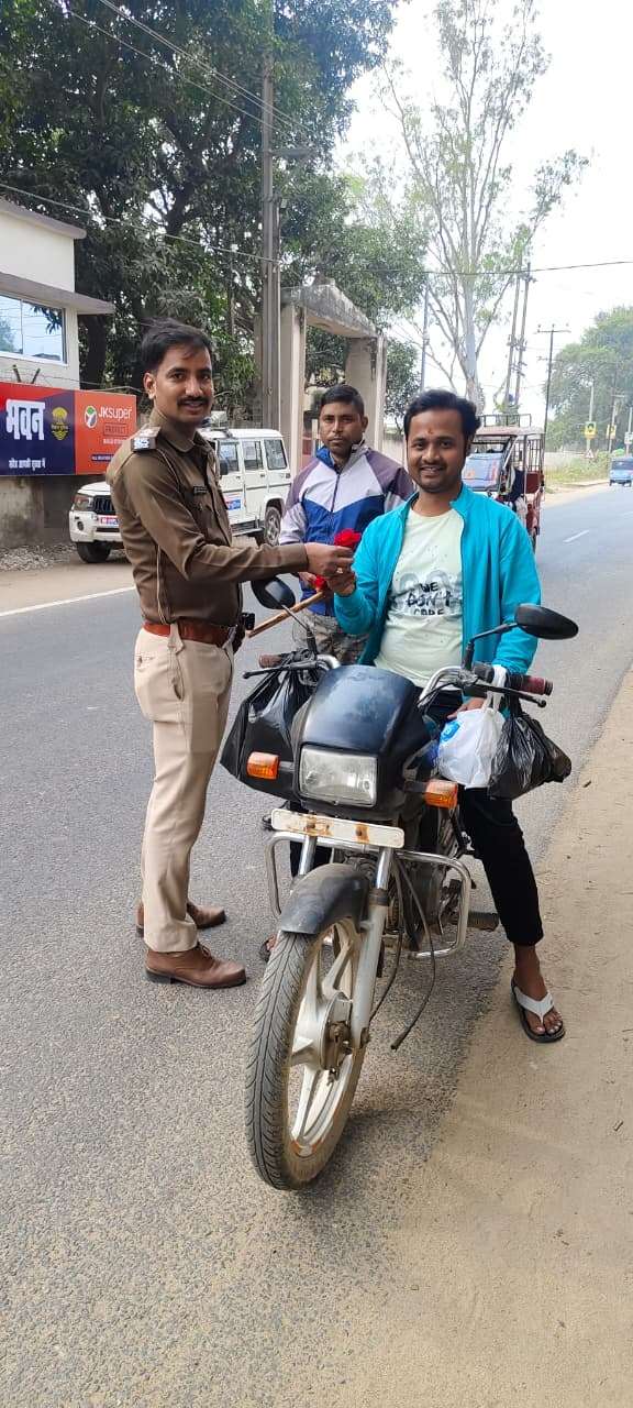 गिद्धौर . सड़क सुरक्षा सप्ताह के तहत पुलिस ने सोमवार को ट्रैफिक नियमों का उल्लंघन करने वाले वाहन चालकों को दंड देने के बजाय गुलाब फूल देकर जागरूक किया. थाना के समीप स्थित चेक पोस्ट पर थानाध्यक्ष दीनानाथ सिंह के नेतृत्व में पुलिस पदाधिकारियों ने नियम तोड़ने वाले चालकों को रोककर उनसे बातचीत की और उनसे यातायात नियमों का पालन करने की अपील की. गुलाब भेंट कर संदेश दिया गया कि सड़क सुरक्षा केवल नियमों से नहीं, बल्कि जागरूकता और जिम्मेदारी से भी संभव है. अवर निरीक्षक जय प्रकाश सिंह ने कहा कि जिला पुलिस प्रशासन के निर्देशन में यह अभियान चलाया जा रहा है. उन्होंने कहा कि ट्रैफिक व्यवस्था को सुचारू बनाए रखने में सबकी सहभागिता आवश्यक है. नियमों का पालन कर लोग न केवल स्वयं की सुरक्षा करते हैं, बल्कि समाज के प्रति अपनी जिम्मेदारी भी निभाते हैं. उन्होंने यह भी स्पष्ट किया कि बार-बार चेतावनी के बावजूद यदि कोई यातायात नियमों का उल्लंघन करता है तो उसके खिलाफ सख्त कार्रवाई की जाएगी. उन्होंने क्षेत्रवासियों से सुरक्षित और जिम्मेदार नागरिक बनने की अपील की. इस अभियान में कई पुलिस अधिकारी व जवान शामिल थे.