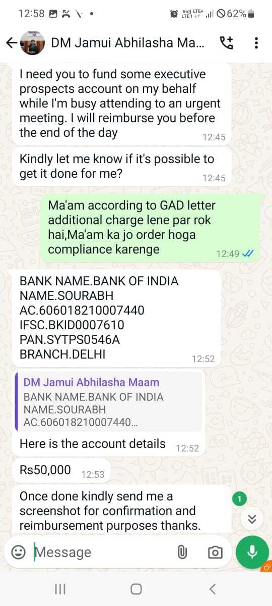 जमुई डीएम के कार्यालय से रविवार को एक आधिकारिक बयान जारी किया गया, जिसमें इस फर्जीवाड़े की जानकारी दी गयी. बताया गया कि जिलाधिकारी के नाम और फोटो का दुरुपयोग कर कुछ शातिर लोग व्हाट्सएप पर पैसे की मांग कर रहे हैं. डीएम कार्यालय ने व्हाट्सएप चैट का एक स्क्रीनशॉट भी साझा किया है, जिसमें फर्जी डीएम ने मदद के लिए पैसे मांगे हैं. डीएम कार्यालय द्वारा साझा किये गये व्हाट्सएप चैट के स्क्रीनशॉट में दिखाया गया है कि फर्जी डीएम ने कहा कि मुझे तुमसे कुछ मदद की जरूरत है. इस वक्त मैं एक जरूरी मीटिंग में हूं और फोन कॉल नहीं कर सकती. मुझे कुछ काम के लिए पैसे चाहिए. अगर तुम पैसे भेज सकते हो, तो बताना. मैं शाम से पहले वापस लौटा दुंगी. सामने वाले व्यक्ति ने जवाब दिया कि वह डीएम के निर्देश का पालन करेगा. इसके बाद फर्जी डीएम ने एक बैंक खाते का नंबर दिया और उसमें 50 हजार रुपये भेजने को कहा.