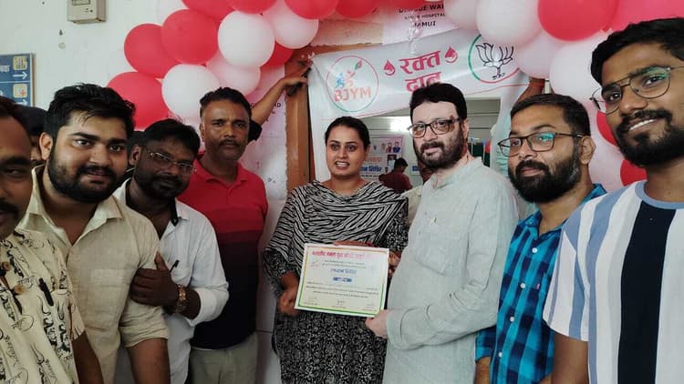 जमुई . प्रधानमंत्री नरेंद्र मोदी के जन्मदिन पर देशभर में चल रहे सेवा पखवाड़ा कार्यक्रम के दौरान शुक्रवार को भाजपा युवा मोर्चा द्वारा सदर अस्पताल परिसर में रक्तदान शिविर लगाया गया. शिविर का उदघाटन जमुई विधायक श्रेयसी सिंह ने फीता काटकर किया. साथ ही विधायक ने स्वयं रक्तदान कर युवाओं को प्रेरित भी किया. इस अवसर पर विधायक ने कहा कि प्रधानमंत्री मोदी जी के जन्मदिन हर साल सेवा पखवारा के रूप में मनाया जाता है. रक्तदान से स्वास्थ्य बेहतर होता है और इससे समाज को जीवनदान मिलता है. उन्होंने जमुई के युवाओं से अपील की कि वे बढ़-चढ़कर ऐसे शिविरों में भाग लें, क्योंकि रक्तदान महादान है और इससे बड़ा कोई उपहार नहीं हो सकता. कार्यक्रम के दौरान दर्जनों युवाओं ने रक्तदान किया. भाजपा युवा मोर्चा के जिला अध्यक्ष अभिषेक राज ने कहा कि यह शिविर सिर्फ एक औपचारिक आयोजन नहीं, बल्कि समाज के लिए जीवनदायी अभियान है. प्रधानमंत्री मोदी के जन्मदिन को रक्तदान जैसे मानवीय कार्य से जोड़कर जमुई भाजपा ने साफ कर दिया कि सेवा ही उनका सबसे बड़ा संकल्प है. बताते चले कि 17 सितंबर से 2 अक्टूबर तक प्रधानमंत्री नरेंद्र मोदी के जन्मोत्सव पर बीजेपी के द्वारा सेवा पखवाड़ा मनाया जा रहा है. इस अवसर पर भाजपा जिलाध्यक्ष समेत कई कार्यकर्ताओं ने भी रक्तदान कर यह संदेश दिया कि राजनीति का असली उद्देश्य जनता की सेवा है.