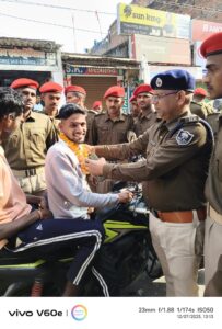 खैरा . सड़क सुरक्षा अभियान के तहत स्थानीय पुलिस ने रविवार को जागरूकता अभियान चलाया. इस दौरान पुलिस पदाधिकारियों ने बिना हेलमेट वाहन का परिचालन करने वाले लोगों को फूल माला पहनाकर उनसे नियमों को मानने की अपील की. इस दौरान थानाध्यक्ष मिंटू कुमार सिंह ने खैरा बाजार में बिना हेलमेट चल रहे बाइक चालकों को जगह-जगह रोक कर उन्हें समझता. थाना अध्यक्ष ने बाइक सवारों से आग्रह किया कि आज से ही हेलमेट पहनकर ही वाहन चलाएं, क्योंकि हेलमेट कोई विकल्प नहीं बल्कि जिंदगी बचाने वाला प्राण रक्षक उपकरण है. उन्होंने कहा कि सुरक्षित रहना हर व्यक्ति की जिम्मेदारी है और उसके लिए ट्रैफिक नियमों का पालन करना बेहद जरूरी है. बताते चलें कि रविवार को जागरूकता के तहत लोगों को समझाने का आखिरी दिन था. आज सोमवार से पुलिस के द्वारा अभियान चलाकर जुर्माना वसूल किया जायेगा. इस दौरान अन्य पुलिसकर्मी एवं जवान भी मौजूद रहे.