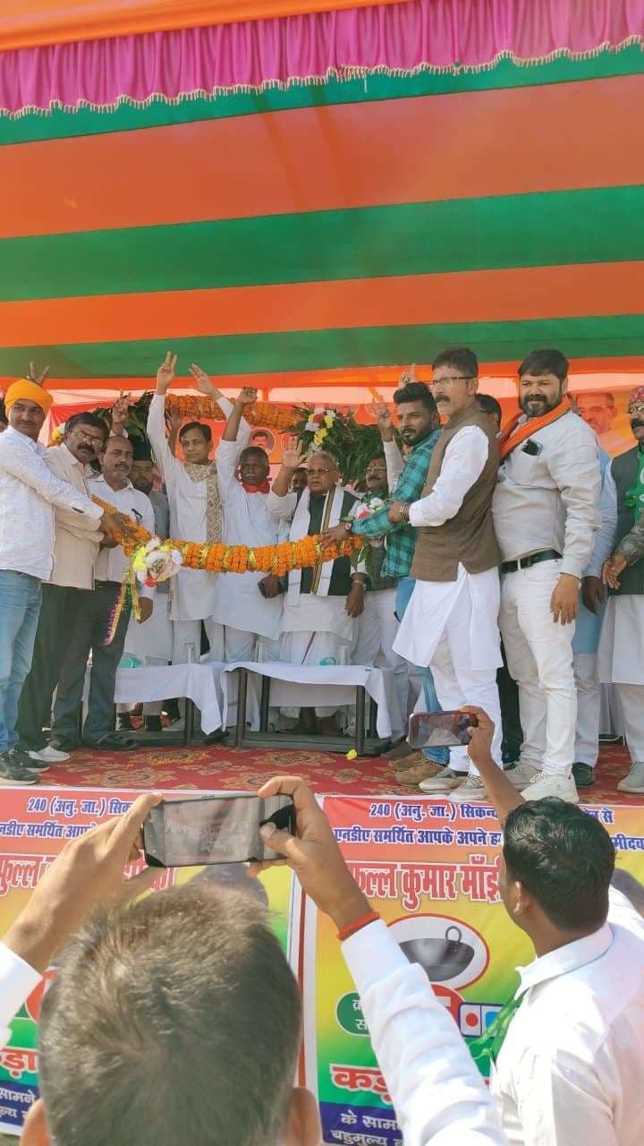 अलीगंज. प्रखंड के सोनखार खेल मैदान में शनिवार को आयोजित चुनावी सभा में हम पार्टी के राष्ट्रीय अध्यक्ष सह केंद्रीय मंत्री जीतन राम मांझी ने एनडीए समर्थित हम पार्टी प्रत्याशी प्रफुल्ल कुमार मांझी के समर्थन में सभा किये. इस दौरान उन्होंने कहा कि एनडीए सरकार के नेतृत्व में बिहार तेजी से विकास की राह पर अग्रसर है. समाज के अंतिम व्यक्ति तक योजनाओं का लाभ पहुंच रहा है. उन्होंने लोगों से अपील की कि अमन, चैन और विकास की निरंतरता के लिए पुनः एनडीए सरकार बनाएं. मांझी ने कहा कि सिकंदरा विधानसभा क्षेत्र से एनडीए समर्थित हिन्दुस्तानी आवाम मोर्चा (से) के प्रत्याशी प्रफुल्ल कुमार मांझी को कढ़ाही छाप पर बटन दबाकर भारी मतों से विजयी बनाएं. उन्होंने कहा कि बिहार की तरक्की और स्थायित्व के लिए मोदी और नीतीश कुमार की जोड़ी को मजबूत करना जरूरी है. वही केंद्रीय गृह राज्य मंत्री नित्यानंद राय ने कहा कि विपक्ष जनता को भ्रमित करने की कोशिश में है, लेकिन लोगों को सचेत रहना होगा. उन्होंने कहा कि राज्य में विकास की रफ्तार तभी जारी रहेगी जब एनडीए की सरकार बनेगी. सभा के दौरान नित्यानंद राय ने मंच से ही एनडीए प्रत्याशी प्रफुल्ल कुमार मांझी को जीत माला पहनाकर उनका सम्मान किया. मौके पर लोजपा (आर) के जिलाध्यक्ष जीवन सिंह, वरिष्ठ नेता अनिल कुमार सिंह, लोजपा (आर) कर्मचारी यूनियन प्रकोष्ठ के प्रदेश अध्यक्ष रविशंकर पासवान, जदयू जिलाध्यक्ष शैलेंद्र महतो, हम जिलाध्यक्ष दामोदर मांझी, सीतल मेहता, नंदकिशोर सिंह, मो नौशाद कैयाम, टिंकू राजा, नीतीश कुशवाहा समेत एनडीए घटक दलों के बड़ी संख्या में कार्यकर्ता मौजूद थे.