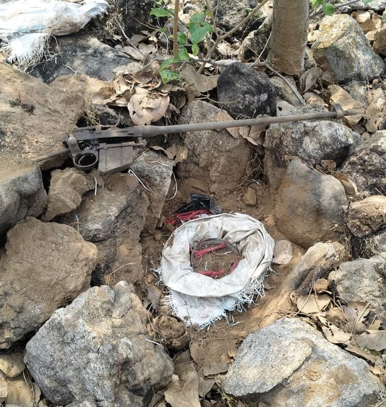 -प्रशिक्षित खोजी कुत्ते की मदद से एसएसबी व चरकापत्थर पुलिस ने की कार्रवाईसोनो. चरकापत्थर थाना क्षेत्र अंतर्गत बाराटांड पहाड़ी जंगल से शनिवार को चरकापत्थर की पुलिस व एसएसबी टीम ने पत्थर के नीचे जमीन में छिपाकर रखे विस्फोटक सामग्री, हथियार व कारतूस बरामद किया है. जंग लगे हथियार व विस्फोटक सामग्रियों की स्थिति को देखकर लगता है कि इसे वर्षों पूर्व छिपाकर रखा गया होगा. मिली सामग्रियों में एक शक्तिशाली केन बम, नौ डिटोनेटर, एक थ्री नट थ्री राइफल का सिर्फ लोहे वाला भाग और उसकी मैगजीन शामिल है. राइफल के पीछे का लकड़ी वाला हिस्सा नहीं होने से इसके काफी पुराने होने की संभावना जताई जा रही है.