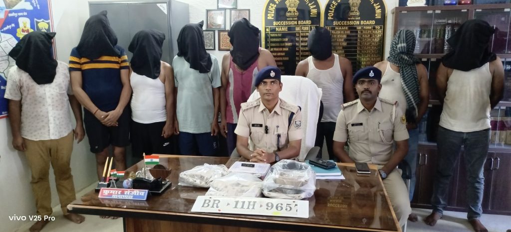 गिरफ्तार अपराधियों की पहचान लखीसराय जिले के कजरा थाना क्षेत्र अंतर्गत कजरा गांव निवासी नरेश कुमार साव पिता स्व लखन साव, मुंगेर जिले के काशीम बाजार थाना क्षेत्र के मोहदीपुर निवासी पवन कुमार मिश्रा पिता स्व सुनील कुमार मिश्रा, राकेश कुमार मिश्रा पिता स्व सुनिल कुमार मिश्रा, अजय कुमार मिश्रा पिता घनश्याम मिश्रा तथा मुंगेर जिले के धरहरा थाना के लकड़ा पाताल निवासी रंजीत कुमार पिता हरिनंदन प्रसाद, मुफस्सिल थाना क्षेत्र के शंकरपुर निवासी धनंजय कुमार पिता राकेश कुमार यादव, कोतवाली थाना क्षेत्र निवासी दलहट्टा गांव निवासी गृह रक्षक वाहिनी से रिटायर जवान नंदन कुमार पिता स्व ओमप्रकाश, थाना क्षेत्र के ही लालदरवाजा निवासी गृह रक्षक वाहिनी में कार्यरत जवान उमेश कुमार पिता जोखो यादव के रूप में हुई है.
