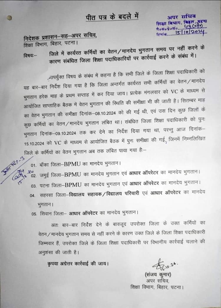 जमुई. शिक्षा विभाग के अपर सचिव संजय कुमार ने बीपीएमयू व आधार ऑपरेटर का मानदेय भुगतान सही समय पर नहीं करने के मामले में डीईओ राजेश कुमार के खिलाफ विभागीय कार्रवाई शुरू करने का निर्देश दिया है. शिक्षा विभाग के अपर सचिव संजय कुमार ने इसे लेकर 15 अक्तूबर को पत्र जारी करते हुए कार्रवाई की अनुशंसा की है. उन्होंने अपने पत्र में कहा कि वीडियो कांफ्रेंसिंग के माध्यम से आयोजित साप्ताहिक बैठक में वेतन भुगतान से संबंधित समीक्षा की जाती है. इसे लेकर जिला शिक्षा पदाधिकारी को बार-बार निर्देश दिया गया है कि जिला अंतर्गत कार्यरत सभी कर्मियों के वेतन या मानदेय का भुगतान प्रत्येक माह के प्रथम सप्ताह में कर दिया जाये. सितंबर के वेतन भुगतान की समीक्षा 8 अक्तूबर को की गयी थी और उस दिन भी जिले के कुछ कर्मियों के वेतन व मानदेय का भुगतान लंबित पाये जाने पर संबंधित जिला शिक्षा पदाधिकारी को पुनः नौ अक्तूबर तक भुगतान कर देने का निर्देश दिया गया था. 15 अक्तूबर को वीडियो कांफ्रेंस के माध्यम से आयोजित समीक्षा बैठक में पाया गया कि जमुई जिले के बीपीएमयू का मानदेय भुगतान व आधार ऑपरेटर का मानदेय भुगतान अब तक लंबित है. अपर सचिव संजय कुमार ने कहा कि बार-बार निर्देश देने के बावजूद उक्त कर्मियों का वेतन, मानदेय भुगतान समय से नहीं करने के लिए जिला शिक्षा पदाधिकारी जिम्मेदार हैं और उन पर विभागीय कार्रवाई चलाने के अनुशंसा की जाती है. इस बारे में जब जमुई जिला शिक्षा पदाधिकारी राजेश कुमार से बात करने की कोशिश की गयी, तो उनके सरकारी मोबाइल नंबर पर संपर्क नहीं हो सका.