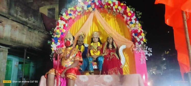 चकाई. हर वर्ष की तरह इस वर्ष भी राम विवाह चकाई बाजार स्थित राम जानकी मंदिर से राम विवाह के मौके पर राम बरात निकाली गयी. इस अवसर पर राम विवाह के आयोजनकर्ता मनी शंकर केशरी द्वारा एक सजे रथ पर भगवान श्रीराम दूल्हा सरकार, माता सीता, भैया लखनलाल व हनुमान के स्वरूप को विधि विधान के साथ दूल्हा-दुल्हन के रूप में रथ पर बिठाकर भव्य बरात की झांकी निकाली गयी. बरात निचे बाजार स्थित राम जानकी मंदिर से चलकर चकाई चौक, रेफरल अस्पताल, थाना मोड़, सरकारी बस पड़ाव, जय प्रकाश चौक, चकाई मोड़, ब्लॉक हनुमान मंदिर होते हुए तथा बरात का नगर भर्मण कराते हुए पुनः बरात राम जानकी मंदिर लौटी. इसके पूर्व बरात में बड़ी संख्या में बराती के रूप में महिलाओं के साथ साथ श्रद्धालु भक्तों ने भी भाग लिया. जम कर दूल्हा सरकार श्रीराम, माता सीता के जयकारे लगाए गये. वहीं ढोल बाजे, बेंजो आदि के धुन पर बरातियों ने जम कर नृत्य किया तथा खूब पटाखे फोड़े. रास्ते में बरातियों. के लिए चाय, काफ़ी, जलपान आदि की भी व्यवस्था आयोजक द्वारा की गई. मौके पर कृष्णा केशरी, राजकुमार केशरी, रितेश केशरी, राहुल केशरी, ओमप्रकाश केशरी, पवन केशरी, संतोष केशरी, संजय गुप्ता, शिव जी केशरी, करू केशरी, जितेंद्र केशरी, ओंकार केशरी, बबलू गुप्ता, शंभू केशरी, अरविंद केशरी, सहित बड़ी संख्या में लोग मौजूद थे.
