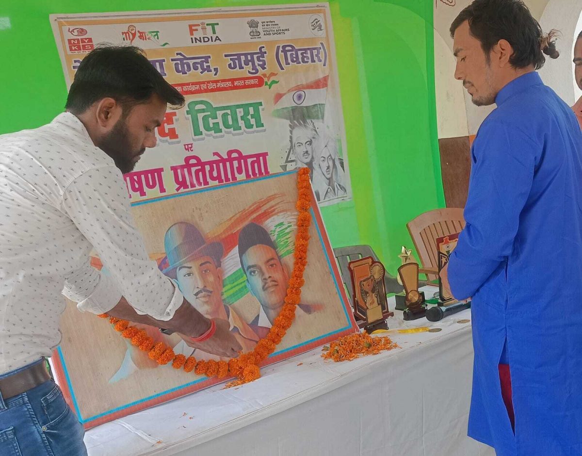 जमुई. नेहरू युवा केंद्र द्वारा शहीद दिवस पर भगत सिंह, सुखदेव और राजगुरु को याद किया तथा उनके जीवनी पर चर्चा की. इस दौरान भाषण प्रतियोगिता जन जागृति युवा क्लब अमरथ की ओर से आयोजित की गयी. इसमें मुख्य अतिथि के तौर पर परशुराम कुमार थे. पूर्व राष्ट्रीय युवा कोर शिवेंद्र कुमार पांडेय ने मंच संचालन किया. इस अवसर पर भारत के क्रांतिकारी शाहिद ए आजम भगत सिंह, सुखदेव और राजगुरु जी को याद किया गया तथा उनके चित्र पर पुष्प अर्पित किया गया तथा उनके साहस, धैर्य और देश के प्रति समर्पित उनके कार्य को बताया गया. भाषण प्रतियोगिता में कई बालिकाओं तथा युवाओं ने भाग लिया जिसमें प्रथम स्थान सुनैना कुमारी, द्वितीय स्थान राजीव कुमार तथा तृतीय स्थान गौरीशंकर कुमार प्राप्त किया. मौके पर शिवेंद्र पाण्डेय ने कहा नेहरू युवा केंद्र सदैव युवाओं के लिए एक राष्ट्रीय स्तर का मंच उपलब्ध करवाता है जो युवाओं को अपने सपने पूरे करने में तथा अपने भविष्य को उज्जवल बनाने में सहयोग करता है. इस कार्यक्रम में परशुराम कुमार, शांतनु कुमार, मनीष पांडेय, सूरज कुमार, अनुज पांडे सहित कई युवा उपस्थित रहे.