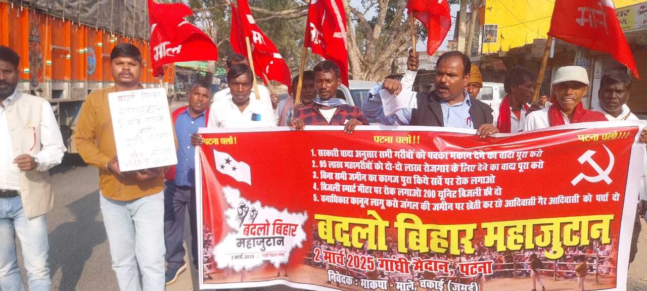 चंद्रमंडीह. दो मार्च को पटना के गांधी मैदान में आयोजित बदलो बिहार महाजुटान रैली की सफलता को लेकर भाकपा माले ने प्रखंड सचिव काॅमरेड मनोज कुमार पांडेय के नेतृत्व में चकाई बाजार में कोष संग्रह अभियान चलाया गया. इस दौरान अधिक से अधिक लोगों से गांधी मैदान पहुंचने का आह्वान किया गया. कोष संग्रह अभियान के दौरान चकाई चौक पर लोगों को संबोधित करते हुए मनोज कुमार पांडेय ने कहा कि बदलो बिहार महाजुटान रैली में बिहार के विभिन्न जन आंदोलनों का महासंगम होगा. उन्होंने कहा कि जमुई जिला में चार लाख बीड़ी मजदूर हैं, परंतु सरकार द्वारा निर्धारित मजदूरी दर एक हजार बीड़ी बनाने पर 397 रुपये के एवज में महज 90 से 100 रुपये दिये जा रहे हैं. उन्होंने कहा कि वनाधिकार कानून को लागू कराने के लिए आदिवासी लगातार संघर्ष कर रहे हैं. यह सरकार वन संरक्षण कानून 2022 लेकर आती है जो जंगल में रह रहे आदिवासियों को भगाने वाल कानून है. ऐसे में इन सभी मुद्दों को लेकर वर्तमान सरकार को उखाड़ फेंकने का शंखनाद रैली में किया जाएगा. मौके पर आदिवासी किसान नेता कालू मरांडी, बासुदेव हांसदा, राजकिशोर किस्कू, राहुल कुमार यादव, राजकिशोर किस्कू, मो सलीम अंसारी, लखिया टुडू, संजय कुमार राय, खुबलाल राणा, सीताराम यादव, जनार्दन यादव, अभय यादव सहित दर्जनों लोग उपस्थित थे.