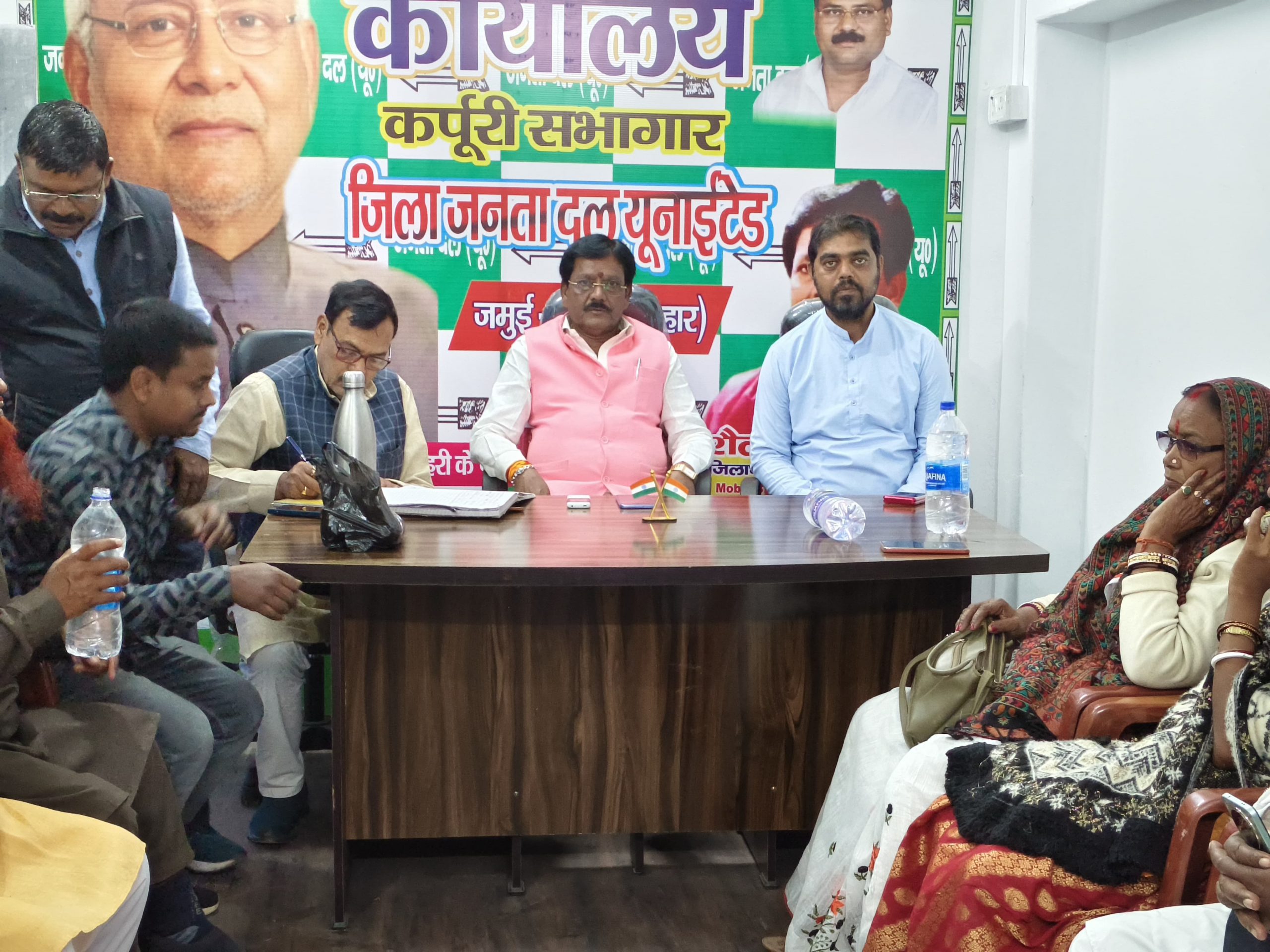 जमुई. आगामी सात फरवरी को मुख्यमंत्री नीतीश कुमार के जमुई आगमन को लेकर मंगलवार को जदयू जिला कार्यालय में जिलाध्यक्ष शैलेंद्र महतो की अध्यक्षता में आवश्यक बैठक की गयी. बैठक में मुख्यमंत्री नीतीश कुमार के कार्यक्रम को लेकर चर्चा की गयी. सर्वसम्मति से निर्णय लिया गया कि मुख्यमंत्री के आगमन को लेकर जिला मुख्यालय में जगह-जगह पर तोरण द्वार बनाया जायेगा, बैनर व पोस्टर लगवाया जायेगा व प्रचार-प्रसार करवाया जायेगा. जिलाध्यक्ष शैलेंद्र महतो ने बताया कि माननीय मुख्यमंत्री का कार्यक्रम ऐतिहासिक होगा. मौके पर जिला उपाध्यक्ष सह प्रवक्ता सुनील वर्णवाल, जिला उपाध्यक्ष पवन रंजन साह, इरशाद खान, जिला सचिव राजेश कुमार, महिला प्रकोष्ठ जिला अध्यक्ष स्नेहलता देवी, युवा प्रकोष्ठ जिलाध्यक्ष सोनू रावत, खेल प्रकोष्ठ जिलाध्यक्ष मनोज कुमार, अल्पसंख्यक प्रकोष्ठ जिलाध्यक्ष मो सलाउद्दीन अंसारी, युवा जदयू प्रदेश उपाध्यक्ष फैयाज अहमद, अल्पसंख्यक प्रकोष्ठ प्रदेश सचिव मो फकरुद्दीन, मो जमीर अंसारी, युवा प्रकोष्ठ जिला महासचिव रोशन शर्मा, दलित प्रकोष्ठ प्रदेश महासचिव अरुण भारती, ग्रामीण चिकित्सा प्रकोष्ठ अध्यक्ष दयानंद यादव, अति पिछड़ा प्रकोष्ठ अध्यक्ष प्रमोद चंद्रवंशी,जमुई प्रखंड अध्यक्ष जमील अहमद, लक्ष्मीपुर प्रखंड अध्यक्ष करुणा देवी, खैरा प्रखंड अध्यक्ष रामानंद सिंह, सिकंदरा प्रखंड अध्यक्ष सूचित कुमार, अलीगंज प्रखंड अध्यक्ष शीतल प्रसाद मेहता, झाझा प्रखंड अध्यक्ष राकेश कुमार दास, युवा जिला उपाध्यक्ष राजेश कुमार वर्मा ,पिंकी कुमारी, उपेंद्र गुप्ता, सुनील सुधाकर, संजय यादव, लखन मंडल, राकेश कुमार उपस्थित थे.