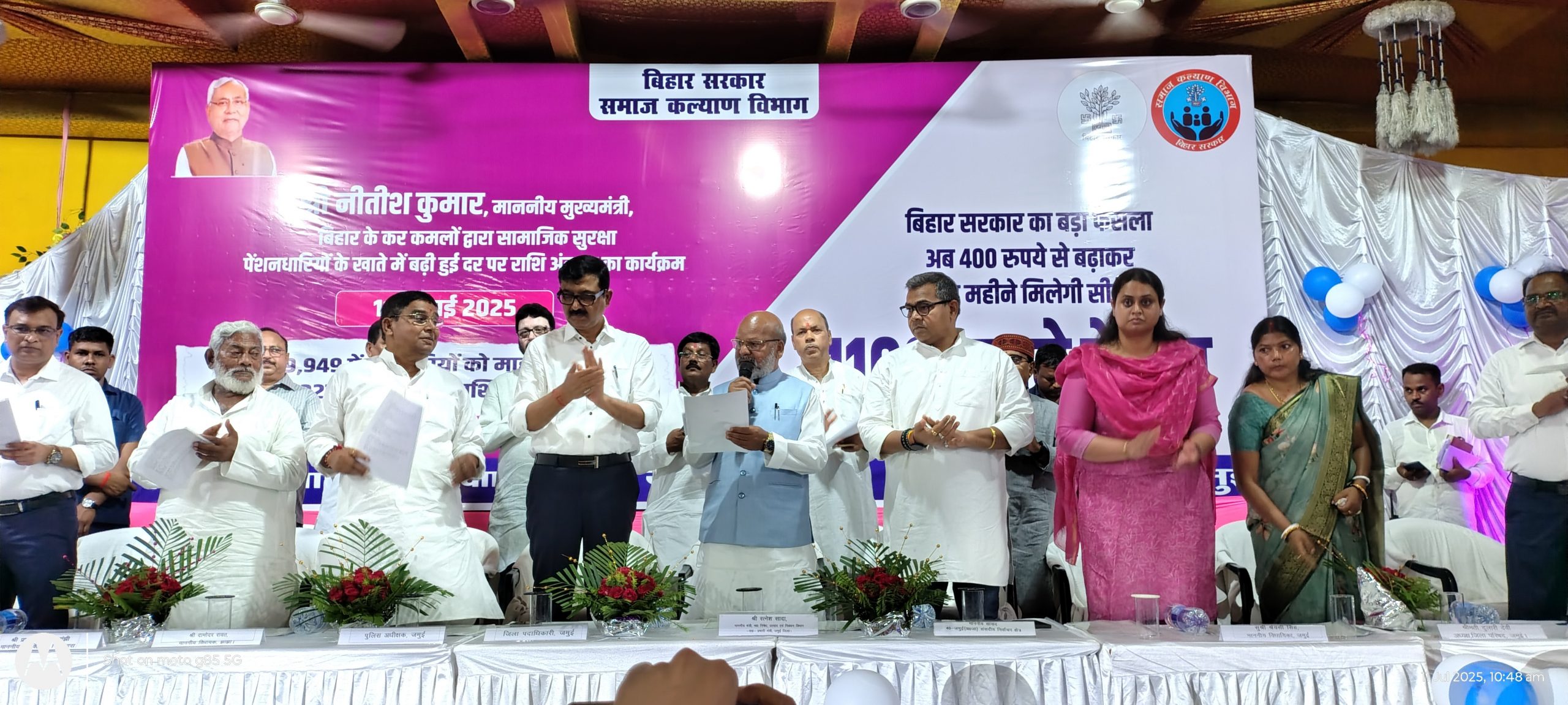 जमुई . सामाजिक सुरक्षा पेंशन लाभार्थियों के लिए शुक्रवार को जिला मुख्यालय स्थित शिल्पा विवाह भवन में कार्यक्रम का आयोजन किया गया. इस अवसर पर मद्य निषेध, उत्पाद एवं निबंधन विभाग के मंत्री सह जिला प्रभारी मंत्री रत्नेश सादा ने मुख्यमंत्री नीतीश कुमार का संदेश पढ़कर सभी लाभार्थियों को सुनाया. उन्होंने कहा कि पेंशन की राशि में ऐतिहासिक बढ़ोतरी कर इसे 400 से बढ़ाकर 1100 प्रतिमाह कर दिया गया है, जो जून 2025 से प्रभावी है. कार्यक्रम में मुख्यमंत्री नीतीश कुमार ने वीडियो संदेश के माध्यम से सभी लाभुकों को संबोधित भी किया और एक बटन दबाकर लाभार्थियों के खाते में एक साथ पेंशन की बढ़ी हुई राशि का स्थानांतरण किया. मुख्यमंत्री ने कहा कि वर्ष 2005 से पहले बिहार की स्थिति क्या थी, यह सभी जानते हैं. आज जो कुछ भी विकास दिख रहा है, वह हमारी सरकार की देन है. अब प्रत्येक महीने की 10 तारीख तक पेंशन की राशि लाभुकों के खाते में आ जायेगी. कार्यक्रम में सांसद अरुण भारती, पूर्व मंत्री सह विधायक दामोदर रावत, विधायक श्रेयसी सिंह, जिला परिषद अध्यक्ष, नगर परिषद अध्यक्ष समेत कई गणमान्य लोग मौजूद रहे. मंच से सभी ने राज्य सरकार के द्वारा किये जा रहे सामाजिक न्याय व समावेशी विकास के संकल्प को दोहराया और कहा कि इससे पेंशन के लाभुकों के जीवन में आर्थिक संबल और आत्मसम्मान की भावना को बल मिलेगा.