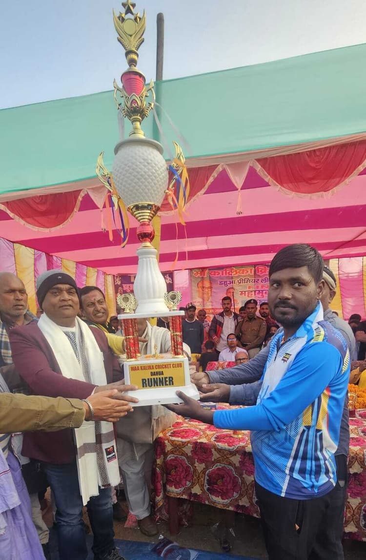 खैरा . प्रखंड की झुंडो पंचायत अंतर्गत डहुआ खेल मैदान में आयोजित डहुआ प्रीमियर लीग क्रिकेट टूर्नामेंट का फाइनल मुकाबला मंगलवार को खेला गया, जिसमें क्रिकेट क्लब केंदुआ ने शानदार प्रदर्शन करते हुए ट्रॉफी अपने नाम कर ली. फाइनल मैच का उद्घाटन पूर्व एमएलसी संजय प्रसाद और भाजपा के वरिष्ठ नेता विकास सिंह ने संयुक्त रूप से किया. विगत पखवारे से चल रहे इस टूर्नामेंट में कुल 16 टीमों ने भाग लिया, जहां सभी मुकाबले नॉकआउट आधार पर खेले गये. लगातार जीत दर्ज करते हुए फाइनल में जमुई और क्रिकेट क्लब केंदुआ की टीमें आमने-सामने हुईं. टॉस जीतकर जमुई की टीम ने पहले बल्लेबाजी करते हुए 16 ओवर में 7 विकेट के नुकसान पर 218 रन बनाये. लक्ष्य का पीछा करने उतरी केंदुआ की टीम ने 15 ओवर में 6 विकेट खोकर 4 विकेट से आसान जीत दर्ज की. फाइनल मुकाबले को देखने के लिए हजारों की संख्या में क्रिकेट प्रेमी मैदान के चारों ओर मौजूद रहे. मैन ऑफ द मैच का पुरस्कार केंदुआ टीम के खिलाड़ी सद्दाम को दिया गया. विजेता टीम को ट्रॉफी के साथ 15 हजार रुपये नकद तथा उपविजेता टीम को रनर ट्रॉफी के साथ 7500 रुपये नकद पुरस्कार मुख्य अतिथियों के हाथों प्रदान किया गया. मैच में अंपायर की भूमिका गौतम पांडे और गुड्डू कुमार ने निभायी. लोगों को संबोधित करते हुए विकास सिंह ने कहा कि खेल से शरीर स्वस्थ रहता है और उज्ज्वल भविष्य की नींव पड़ती है. उन्होंने आयोजन समिति को सफल और पारदर्शी आयोजन के लिए बधाई दी. आयोजन में वीरेंद्र शर्मा, पंचायत समिति सदस्य गुड्डू सिंह, पैक्स अध्यक्ष मकेश्वर सिंह, उदय नारायण सिंह, पंचानन पांडे, चंदन पांडे, दीपक राम, छोटन सिंह, सुनील सिंह, रविंद्र सिंह, वीरेंद्र पांडे, संतोष पांडे सहित कई लोग सक्रिय रूप से शामिल रहे.