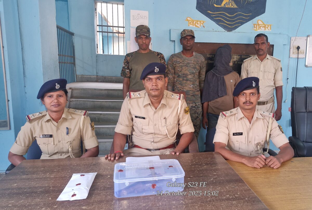 सिकंदरा. सिकंदरा पुलिस ने गुप्त सूचना के आधार पर थाना क्षेत्र के पंचमहुआ गांव में छापेमारी कर एक युवक को दो अवैध कट्टों के साथ गिरफ्तार कर लिया. पुलिस ने आरोपित के पास से दो मोबाइल फोन को भी जब्त किया हैं. इस संबंध में थानाध्यक्ष पंकज कुमार ने बताया कि थाना कांड संख्या 290/25 के अनुसंधान के क्रम में पुलिस को सूचना मिली थी कि पंचमहुआ निवासी सुभाष यादव पिता दशरथ यादव, अपने घर में अवैध हथियार रखे हुए है और किसी आपराधिक घटना को अंजाम देने की फिराक में है. सूचना पर उसके घर की तलाशी ली गयी. तलाशी के दौरान सुभाष यादव के घर से दो कट्टा, दो मोबाइल फोन को बरामद किया गया. पुलिस ने बरामद हथियारों को जब्त करते हुए आरोपित सुभाष यादव को गिरफ्तार कर लिया. अवर निरीक्षक पियुष कुमार के आवेदन पर सिकंदरा थाने आर्म्स एक्ट के तहत मामला दर्ज किया गया है. छापामारी दल में थानाध्यक्ष पंकज कुमार, पुअनि पियुष कुमार, पुअनि रीमा कुमारी, जिला आसूचना इकाई जमुई एवं सिकंदरा थाना के सशस्त्र बल शामिल थे.