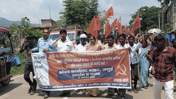 जमुई. अखिल भारतीय ग्रामीण खेत मजदूर सभा के नेतृत्व में सैकड़ों के संख्या महिला पुरुष मजदूर सरकार की नीतियों के खिलाफ शुक्रवार को अंचल कार्यालय बरहट के समक्ष प्रदर्शन किया. भाकपा माले नेता बाबू साहब सिंह खेत मजदूर नेता बासुदेव रॉय, विद्यालय रसोईया संघ के जिला सचिव मो हैदर ने प्रदर्शन का नेतृत्व किया. प्रदर्शन कर रहे लोग के वास-आवास के लिए गरीबों, भूमिहीनों के लिए जमीन का पर्चा की मांग कर रहे थे. साथ ही गरीबों को वार्षिक आमदनी 70,000 रुपये से कम का आय प्रमाणपत्र देने, सभी गरीब परिवारों को दो लाख रुपये सरकारी अनुदान देने, सभी भूमिहीन परिवारों को 5-5 डिसमिल वास भूमि और पक्का मकान देने, स्मार्ट मीटर बंद करने तथा गरीब परिवारों को 200 यूनिट प्रति माह बिजली फ्री देने की मांग की. मौके पर माले नेता बाबू साहब सिंह कहा की बिहार में हुए जाति आधारित गणना ने बिहार में गरीबी की भयावह तस्वीर पेश की है. करीब साढ़े 94 लाख अतिनिर्धन परिवारों की मासिक आय महज 6 हजार रुपये से कम है. मुख्यमंत्री ने विगत जनवरी माह में इनको गरीबी से बाहर निकालने के लिए 2 लाख रुपये का अनुदान देने की घोषणा की थी. लघु उद्यमी योजना के तहत व्यवसाय शुरू करने के लिए सरकार 3 किश्तों में यह राशि देगी. घोषणा के आठ महीने बीत गए, लेकिन इस मामले में कोई ठोस प्रगति नहीं दिखती. जमीन के अभाव में वे गृहविहीन हैं. ये लोग नहर के किनारे, सड़क के किनारे रेलवे लाइन के किनारे झुगी झोपड़ी बना कर अपनी जिंदगी गुजर बसर करने पर मजबूर हैं. बीडीओ और सीओ प्रदर्शकारियों के बीच पहुंचे और पांच सूत्री मांग सहित वास-आवास के तहत गरीब भूमिहीनों को पांच डिसमिल के लिए 904 फार्म को जमा लिया. साथ ही उन्होंने कहा कि जमा लिए फॉर्म के अनुसार अग्रेतर करवाई करते हुए लाभुकों का उनका लाभ दिया जायेगा. प्रदर्शन में अर्जुन मांझी, शंभू मांझी, भरत मांझी, शरीफ मांझी, तुलसी मांझी, संजय मांझी, राकेश कुमार, विमली देवी, सुनीता हेम्ब्रम, ब्रमदेव मांझी, गोरे मांझी, सरिता देवी, डसवा देवी, ललित मरांडी, रूबी देवी, किरण देवी सहित सैकड़ों लोग उपस्थित थे.