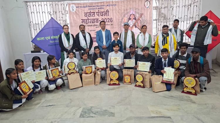 जमुई. 26 जनवरी को कला एवं संस्कृति विभाग और जिला प्रशासन जमुई के संयुक्त तत्वावधान में बसंत पंचमी महोत्सव 2026 का आयोजन किया गया था. डीपीआरओ बिनोद प्रसाद ने बताया कि महोत्सव में जिले के सरकारी व निजी विद्यालयों के छात्र-छात्राओं, स्थानीय युवा कलाकारों तथा सरकारी विद्यालयों के कला शिक्षकों ने भाग लिया. इस दौरान प्रदर्शनी में चित्रकला, फोटोग्राफी, मूर्तिकला एवं क्राफ्ट कलाकृतियों का प्रदर्शन किया गया, जिसकी दर्शकों ने खूब सराहना की थी. इसके बाद 27 जनवरी से 31 जनवरी 2026 तक चंद्रशेखर सिंह संग्रहालय, जमुई में आयोजित कला प्रदर्शनी भी लोगों को काफी पसंद आयी. बड़ी संख्या में लोगों ने प्रदर्शनी का अवलोकन किया और कलाकारों के कार्यों की प्रशंसा की. प्रतियोगिता के तहत विभिन्न विधाओं में युवा कलाकारों को पुरस्कार देकर सम्मानित किया गया. इसमें चित्रकला में प्रथम पुरस्कार हर्ष कुमार को, द्वितीय पुरस्कार प्रियंका व नेहा कुमारी को तथा तृतीय पुरस्कार प्रज्ञा कुमारी व सूरज कुमार को दिया गया. मूर्तिकला में प्रथम पुरस्कार अविनाश कुमार, द्वितीय पुरस्कार सोहा कुमार, तृतीय पुरस्कार कृष्णा कुमार पांडेय को मिला. क्राफ्ट में प्रथम पुरस्कार प्रियांशु, द्वितीय पुरस्कार राजन कुमार और तृतीय पुरस्कार साक्षी कुमारी को प्रदान किया गया. फोटोग्राफी में विजेता का खिताब देवांशु कुमार यादव ने प्राप्त किया. कार्यक्रम में जिले के कला शिक्षकों का भी महत्वपूर्ण योगदान रहा. इनमें गौतम कुमार सिंह, जय प्रकाश शर्मा, परशुराम मंडल, कुमार दुश्यंत, धनराज चौधरी, लक्की अली सहित अन्य शिक्षक शामिल रहे. इसके अलावा स्वतंत्र युवा कलाकारों में मुन्नू कुमार की मूर्तिकला आकर्षण का केंद्र रही. वहीं धर्मवीर कुमार की पोस्टर पेंटिंग और विक्रमराज की लैंडस्केप पेंटिंग को भी दर्शकों ने खूब सराहा. कहा कि बसंत पंचमी महोत्सव 2026 जिले में कला-संस्कृति को नयी पहचान देने वाला बना.