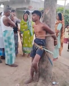थाना परिसर से सटे पतसंडा मुस्लिम टोले में रविवार की अहले सुबह एक युवक को पेड़ से बांध कर उसकी बेरहमी से पिटाई की गयी.