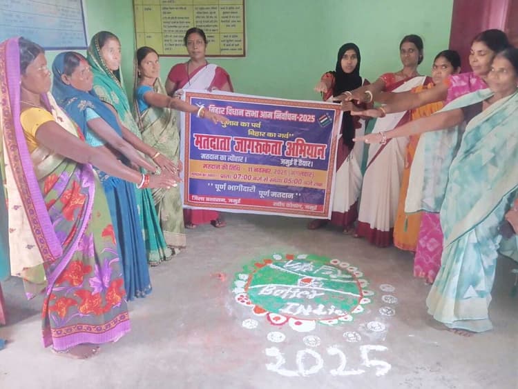 जमुई. आगामी विधानसभा चुनाव को लेकर शनिवार को जमुई विधानसभा क्षेत्र 241 अंतर्गत बूथ संख्या 203 पर मतदाता जागरूकता कार्यक्रम का आयोजन किया गया. कार्यक्रम में आंगनबाड़ी केंद्र की सेविका ललिता कुमारी ने रंगोली के माध्यम से लोगों को मतदान के लिए प्रेरित किया. इस दौरान उपस्थित ग्रामीण महिलाओं और पुरुषों को मतदान के महत्व की जानकारी दी गयी व सभी को 11 नवंबर को होने वाले विधानसभा चुनाव में शत-प्रतिशत मतदान करने की शपथ दिलायी गयी. कार्यक्रम में लोगों ने अपने परिवार और आस-पड़ोस के मतदाताओं को भी मतदान के प्रति जागरूक करने का संकल्प लिया. सेविका ने उपस्थित लोगो को बताया कि इस पहल का उद्देश्य लोकतंत्र को मजबूत बनाना और अधिक से अधिक मतदाताओं की भागीदारी सुनिश्चित करना है.