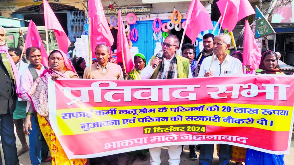 उक्त मांगों को लेकर भाकपा-माले कार्यालय से प्रतिवाद मार्च निकालते हुए अरवल मोड़ पर प्रतिवाद सभा किया. सभा का नेतृत्व भाकपा-माले जिला सचिव रामाधार सिंह, नगर सचिव मुकेश पासवान, माले नेता अविनाश कुमार, संजय चंद्रवंशी, मुकेश चंद्रवंशी यदुनंदन दास, महिला नेत्री संजू देवी कर रही थी. नेताओं ने कहा 14 दिसंबर को लल्लू डोम की हत्या उस समय हुई, जब वह सड़क से कचरे का उठाव कर ट्रैक्टर के डल्ले में डाल रहा था. प्यास लगने पर वह बगल के चाय दुकान से पानी का मग उठाकर पानी पीने लगा. जिस पर चाय दुकानदार ने लोहे की रॉड से उसके सिर पर वार कर दिया जिससे उसका सिर फट गया. सदर अस्पताल ले जाते उक्त सफाईकर्मी की मौत हो गयी थी.