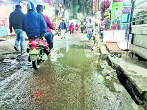 शहर के सब्ज़ी मंडी में पीली कोठी के निकट सड़क पर नाली का गंदा पानी बह रहा है. पिछले तीन दिनों से नाली का पानी ओवरफ्लो होकर सड़क पर ही बह रहा है जिसके कारण बगैर बारिश के ही उस पथ पर जलजमाव हो गया है.