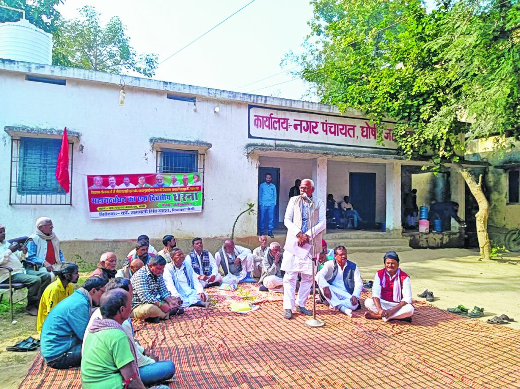 विकास योजनाओं में नौकरशाही हस्तक्षेप तथा बुलडोजर राज के खिलाफ समग्र विकास के सवाल पर मंगलवार को नगर पंचायत कार्यालय घोसी के समीप महागठबंधन के बैनर तले एक दिवसीय धरना का आयोजन किया गया.