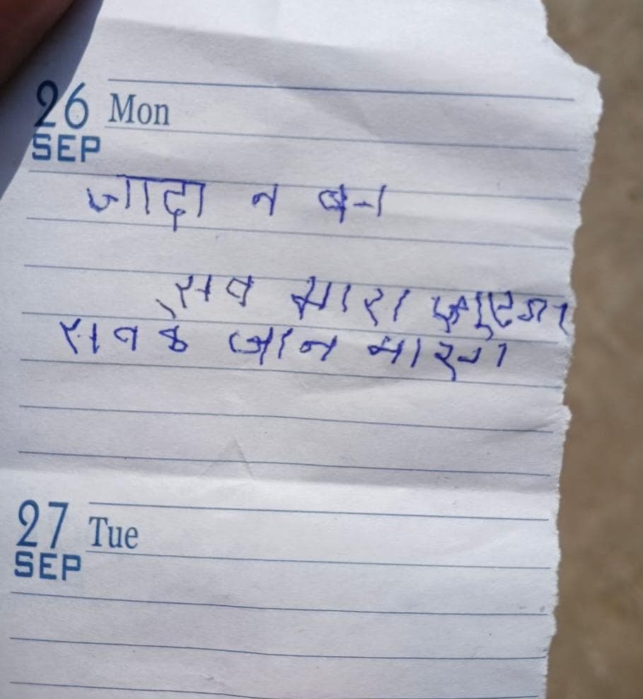 परिजनों ने तुरंत इसकी सूचना स्थानीय थाना और जांच कर रही सीबीआई टीम को दी. सूचना मिलते ही शकूराबाद थाना अध्यक्ष राहुल कुमार गांव पहुंचे. उन्होंने पर्चे को कब्जे में लेकर जांच शुरू कर दी है. उन्होंने कहा कि पहली नजर में यह किसी असामाजिक तत्व की हरकत लगती है. पूरी जांच के बाद ही सच सामने आएगा.