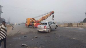 एनएच-19 पर डिवाइडर से टकराकर शराब से भरी कार पलटी, तस्कर फरार