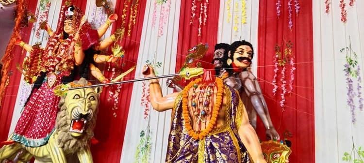 भभुआ शहर. स्थानीय शहर के नगरपालिका मैदान में वार्ड नंबर 11 व 12 के लोगों द्वारा विगत कई वर्षों से मां दुर्गा की स्वचालित मूर्ति व भव्य पंडाल आदि की स्थापना त्रिमूर्ति एकता नवयुवक समिति द्वारा की जाती रही है, जिसे देखने के लिए शहर सहित दूर दूर से लोग देखने के लिए आते हैं. इस साल भी यहां स्वचालित मशीनों के माध्यम से मां दुर्गा राक्षसों का सिर काटते हुए वध करती नजर आ रही हैं. यह दृश्य बच्चे, बुजुर्ग व खासकर महिलाओं सहित सभी को खूब आकर्षित कर रहा हैं. पंडाल की देखरेख कर रहे त्रिमूर्ति एकता नवयुवक समिति के अध्यक्ष विकास तिवारी ने बताया इस आधुनिक युग में युवाओं को प्रेरित करने के लिए इस तरह के दृश्य का निर्माण स्वचालित मशीनों के माध्यम से किया गया है. पूजा समिति के लोगों सहित पुलिस प्रशासन को लोगाें की भीड़ नियंत्रित करने के लिए काफी मशक्कत करनी पड़ रही है. मेला घूमने आये आम लोगाें से भी अपील की कि लोग मां दुर्गा के दर्शन के दौरान व्यवस्था बनी रही, इसे लेकर सहयोग करें.
