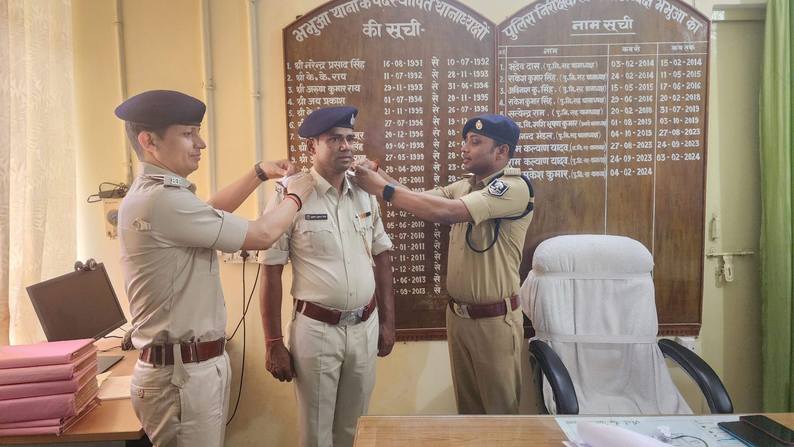 भभुआ सदर. कैमूर जिला बल के चार पीटीसी सिपाहियों को पुलिस सहायक अवर निरीक्षक यानी एएसआइ के पद पर प्रोन्नति दी गयी है, जो फिलहाल भभुआ सदर थाने में तैनात हैं. प्रोन्नत पाये पुलिसकर्मियों में पीटीसी दिग्विजय कुमार, सुनील कुमार सिंह, राजेश कुमार, रामस्वारथ सिंह हैं. बुधवार को इस अवसर पर भभुआ एसडीपीओ शिवशंकर कुमार व इंस्पेक्टर सह सदर थाना अध्यक्ष मुकेश कुमार ने सभी नवप्रोन्नत पुलिसकर्मियों को कंधे पर स्टार लगाकर उनके उज्वल भविष्य की शुभकामनाएं दीं. इस मौके पर एसडीपीओ ने पदोन्नत पुलिसकर्मियों से कहा कि अब उनकी जिम्मेदारी और बढ़ गयी है और उन्हें पहले से अधिक सतर्कता और संवेदनशीलता के साथ अपने कर्तव्यों का निर्वहन करना होगा, उन्होंने सभी को बेहतर पुलिसिंग के लिए सतत प्रयासरत रहने और आमजन के बीच पुलिस की सकारात्मक छवि बनाये रखने का संदेश दिया. इधर पदोन्नति प्राप्त सिपाहियों के कंधों पर स्टार लगते ही उनके भी चेहरे पर उत्साह और गर्व का भाव देखा गया.