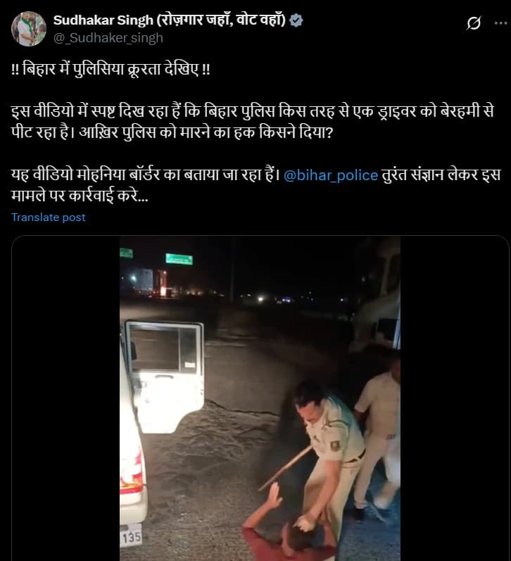 Kaimur News: सोशल मीडिया पर पुलिसिया बर्बरता का एक वीडियो खूब वायरल हो रहा है. वीडियो में साफ दिख रहा है कि बिहार पुलिस के कुछ जवान कैसे एक ड्राइवर को बुरी तरह पीट रहे हैं. राजद एमपी सुधाकर सिंह ने अपने X हैंडल पर इस वीडियो को शेयर करते हुए कार्रवाई की मांग की है.