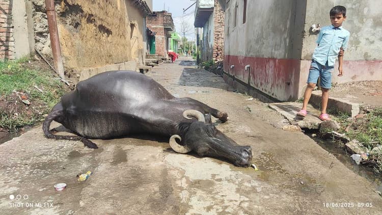 करेंट प्रवाहित पोल की चपेट में आयी भैंस