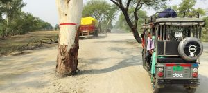 सूर्यपुरा पुल के समीप सड़क पर खड़े पेड़ हादसे को दे रहा निमंत्रण