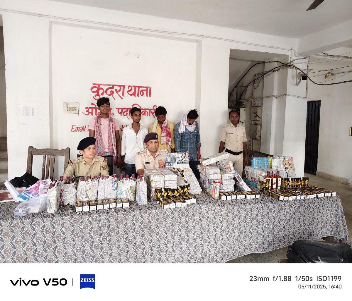 कुदरा पुलिस ने रविवार को रेलवे स्टेशन के पास से चार धंधेबाजों को 77 लीटर अंग्रेजी शराब के साथ गिरफ्तार किया है.